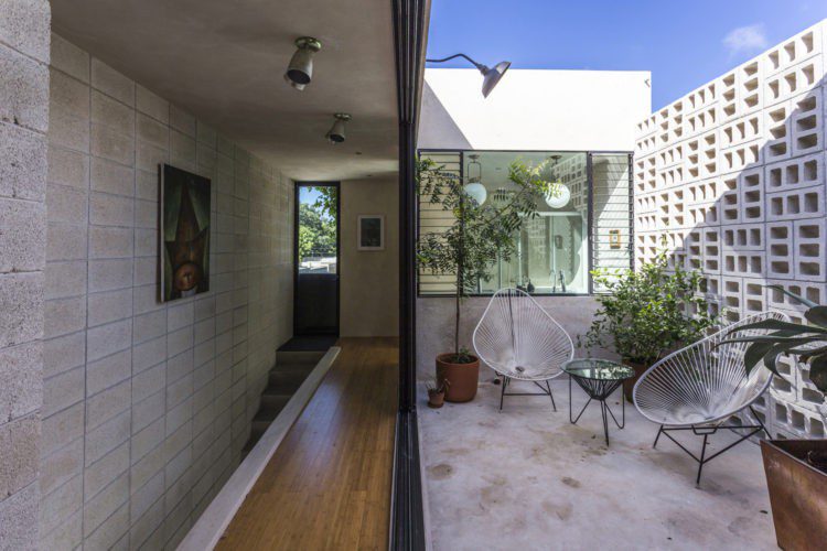 “…Las puertas corredizas de cristal hacia la chimenea de aire, crean una entrada de luz natural con mayor ventilación y el muro vegetal refuerza la barrera térmica, brindándole frescura y naturaleza al espacio…”