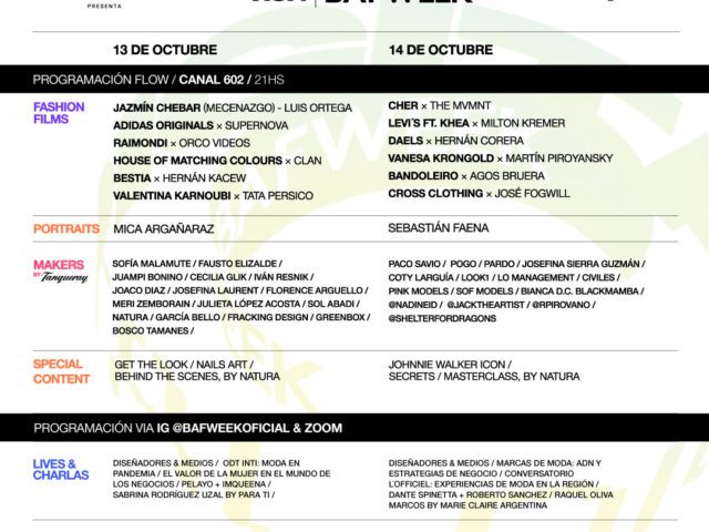 El ciclo se podrá ver en vivo por el canal de 602 de Flow y luego del evento, quedará disponible en la plataforma de entretenimiento para ver a demanda, desde cualquier dispositivo y en el momento que se desee. Además de los fashion films, VISA BAFWEEK presenta una serie de contenidos que buscan indagar en los cambios que propone la nueva normalidad y presentar diversas miradas acerca de los temas que interpelan constantemente a las marcas y sus protagonistas.