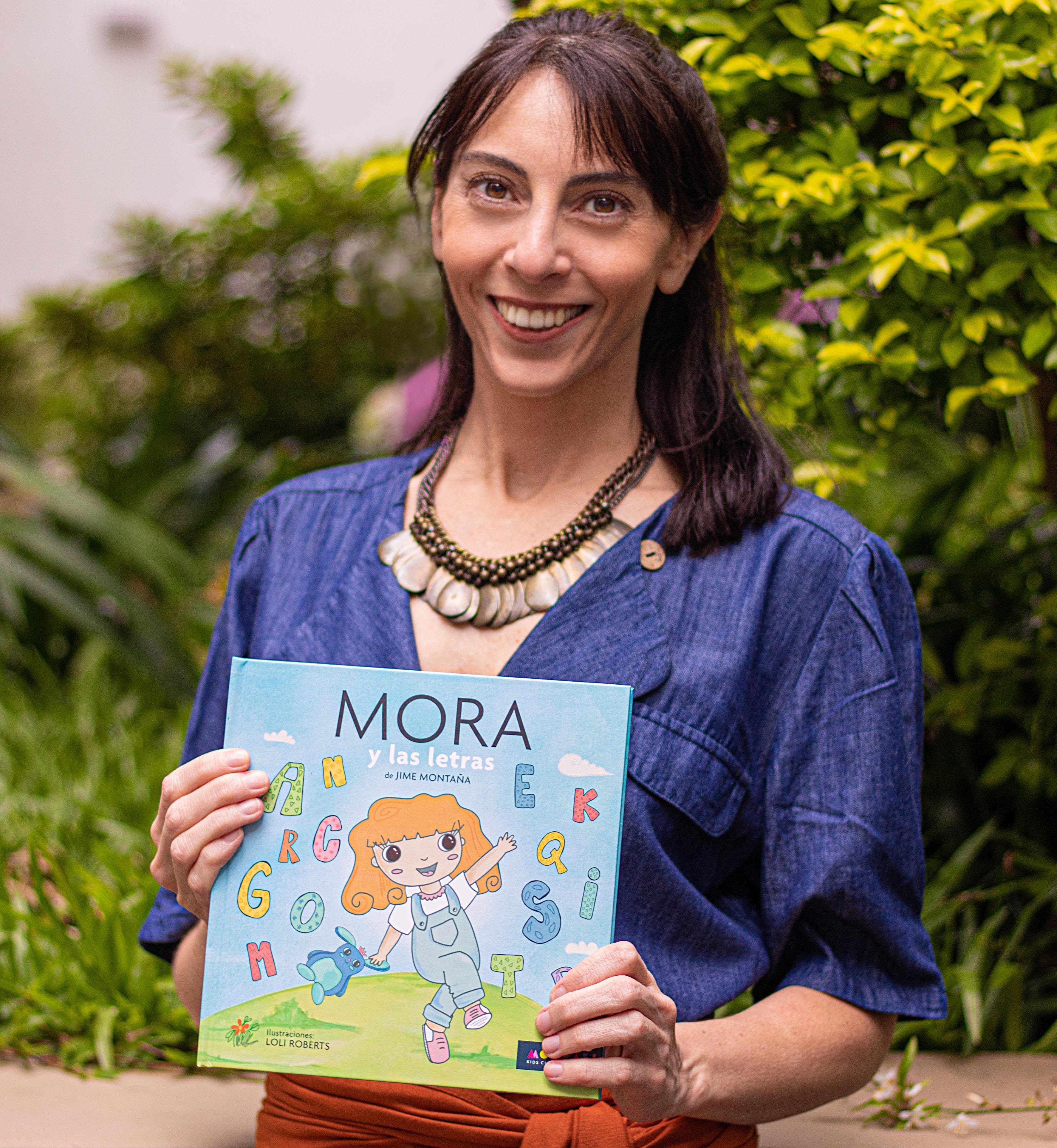 Un día de encierro, Jime Montaña jugaba con su hija Mora (en ese momento de 3 años) a descubrir cómo se transformaban las palabras al cambiarles la primera letra. Al notar que su hija se divertía y motivaba al identificar las letras, sus sonidos y pensar transformaciones posibles, Jime pensó seriamente en convertir la propuesta lúdica en un libro. Creyó que plasmar un recurso divertido, sencillo y cotidiano serviría a otros adultos que crían y quieren enriquecer el aprendizaje de sus niños. Para llevar adelante este objetivo, Jime tomó cursos a distancia en el International Montessori Institute y comenzó a darle forma a su primer libro: Mora y las letras.