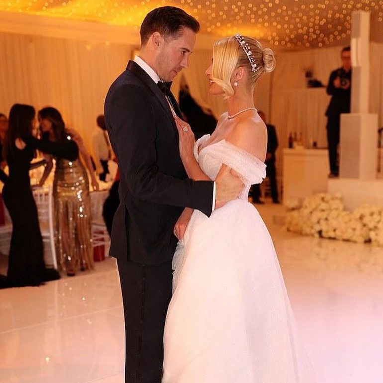 Hilton llevó un vestido con un escote más profundo de talle tipo corset, mangas caídas y falda amplia. El glow extra estuvo a cargo de los pequeños destellos que tenía la tela y que complementó con una tiara. Para seguir brillando en su gran día utilizó una confección de Pamella Roland.
