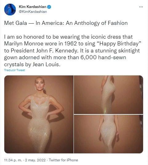 A través de su cuenta oficial de Twitter, la empresaria estadounidense contó: «Me siento muy honrada de usar el vestido icónico que usó Marilyn Monroe en 1962 para cantar Feliz cumpleaños al presidente John F. Kennedy. Es un impresionante vestido ceñido adornado con más de 6000 cristales cosidos a mano por Jean Louis».