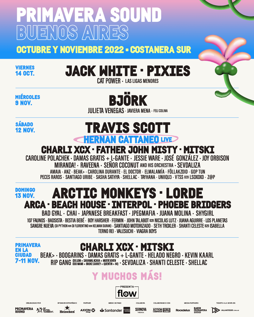 El primer lineup será uno para recordar, con artistas de primer nivel internacional como Arctic Monkeys, Travis Scott, Lorde, Jack White, Pixies, Bjork, Charli XCX y Mitski, entre muchísimos otros. Varios de ellos han lanzado o están próximos a lanzar nuevos trabajos discográficos por esas fechas, con lo cual el festival promete ser ocasión para escuchar música fresca en vivo por primera vez: Jack White lanzó dos álbumes –Fear of the Dawn y Entering Heaven Alive– en lo que va de 2022; mientras que Pixies, Arctic Monkeys y Bjork anunciaron que estarán lanzando discos nuevos.