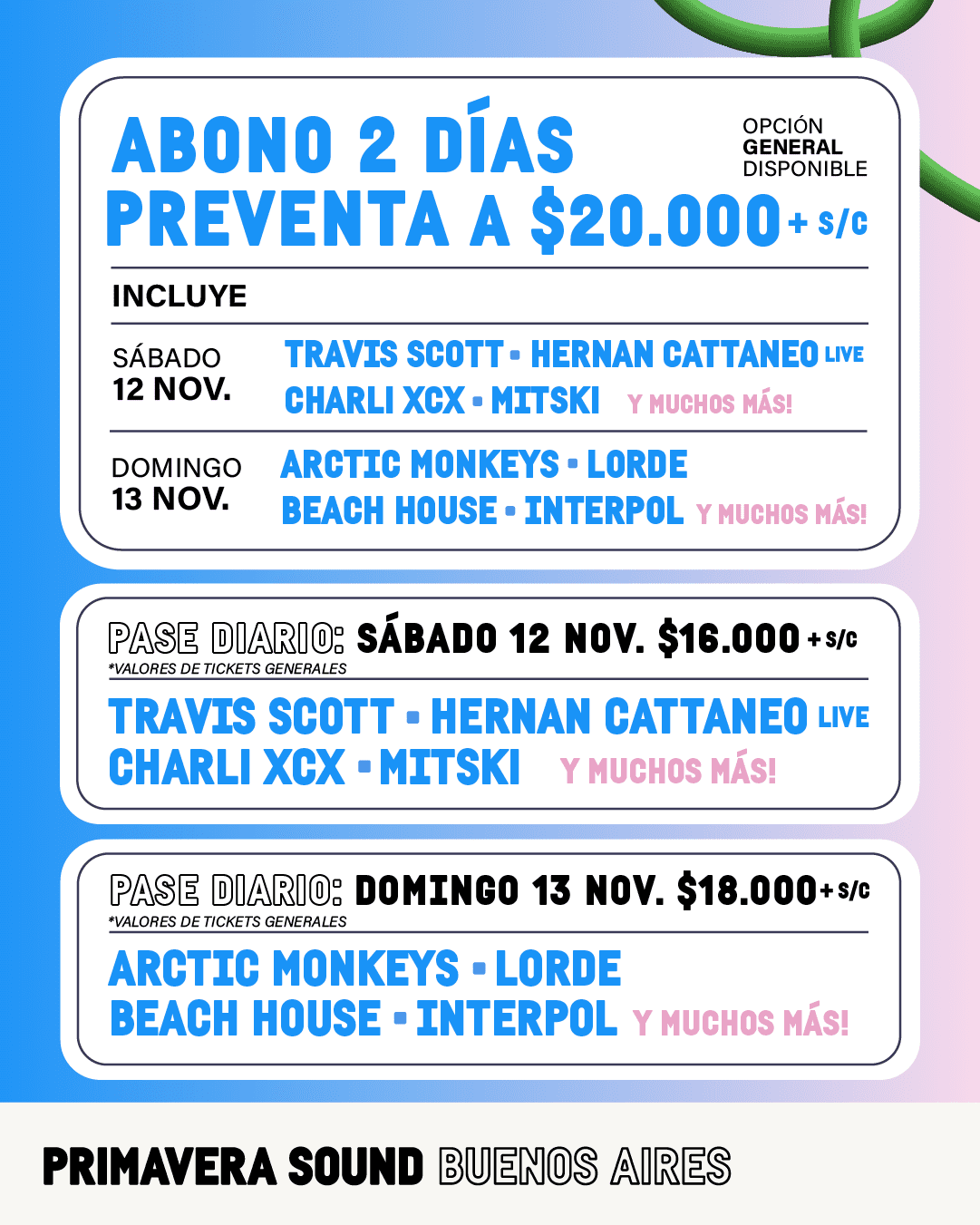 El festival confirma un nuevo abono de fin de semana para las fechas del sábado 12 y domingo 13 de noviembre a $20.000 + service charge. Quienes hayan adquirido tickets para solo una de las fechas de ese fin de semana podrán optar por el upgrade, pagando la diferencia entre el valor de su entrada y esta nueva opción.