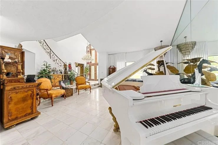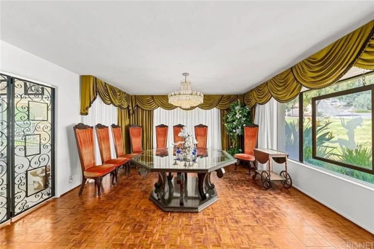La residencia construida en 1975, tiene 4 dormitorios y 3 baños completos. El área del comedor, probablemente le haya causado un shock a primera vista a la familia amante del estilo minimalista, ya que la nueva casa se caracteriza por tener una decoración excéntrica, repleta de detalles dorados, muchos muebles y alfombras de colores vivos.