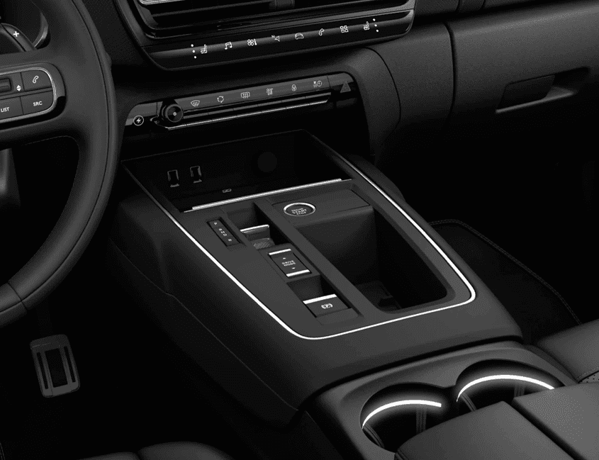 La consola central, alta y ancha, ha sido modernizada con una tapicería de tela negra con efecto de cuero y bordes cromados. Incluye el nuevo selector de marchas e-Toggle con acabado cromado y el selector de modos de conducción, con función Grip Control.