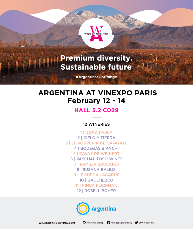 Wines of Argentina (WofA), entidad responsable de la promoción del Vino Argentino en los mercados del mundo, participará por segundo año consecutivo de VINEXPO PARÍS, la feria de vinos y espirituosas que se presenta como el mayor evento en París para el trade internacional, a desarrollarse del 12 al 14 de febrero próximos. La presencia argentina cuenta con el apoyo del Ministerio de Relaciones Exteriores, Comercio Internacional y Culto de la Nación y la Embajada Argentina en Francia.