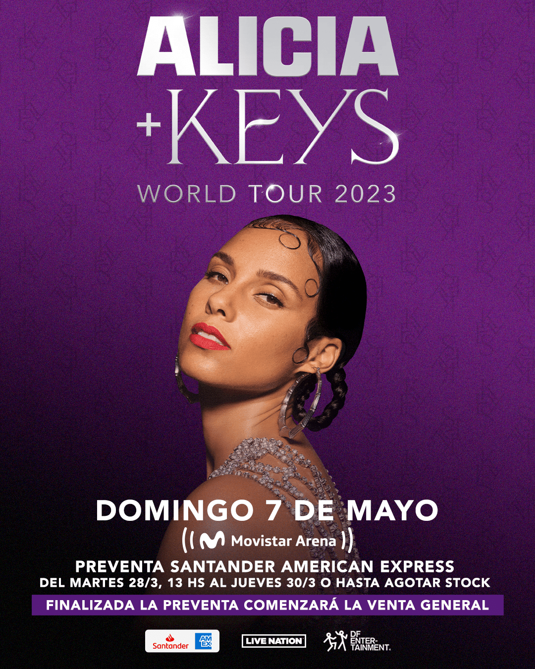 Luego del éxito rotundo de su gira mundial Alicia + Keys World Tour tanto por Europa como por los Estados Unidos en 2022, Alicia Keys anuncia finalmente la etapa latinoamericana de su gira mundial, que incluirá paradas en Brasil, Argentina, Chile y México. La multipremiada artista dará un show en Buenos Aires el domingo 7 de mayo en el Estadio Movistar Arena, producido por Live Nation y DF Entertainment, con escenografía, iluminación y vestuario inspirados en su amigo y mentor Prince. La preventa exclusiva para clientes Santander American Express, comenzará el martes 28 de marzo a las 13 hs, por 48 horas o hasta agotar stock, mientras que la venta general se habilitará a partir del jueves 30 de marzo a la misma hora. En ambos casos, las entradas se conseguirán únicamente por EntradaUno y en 3 cuotas sin interés para clientes Santander American Express.