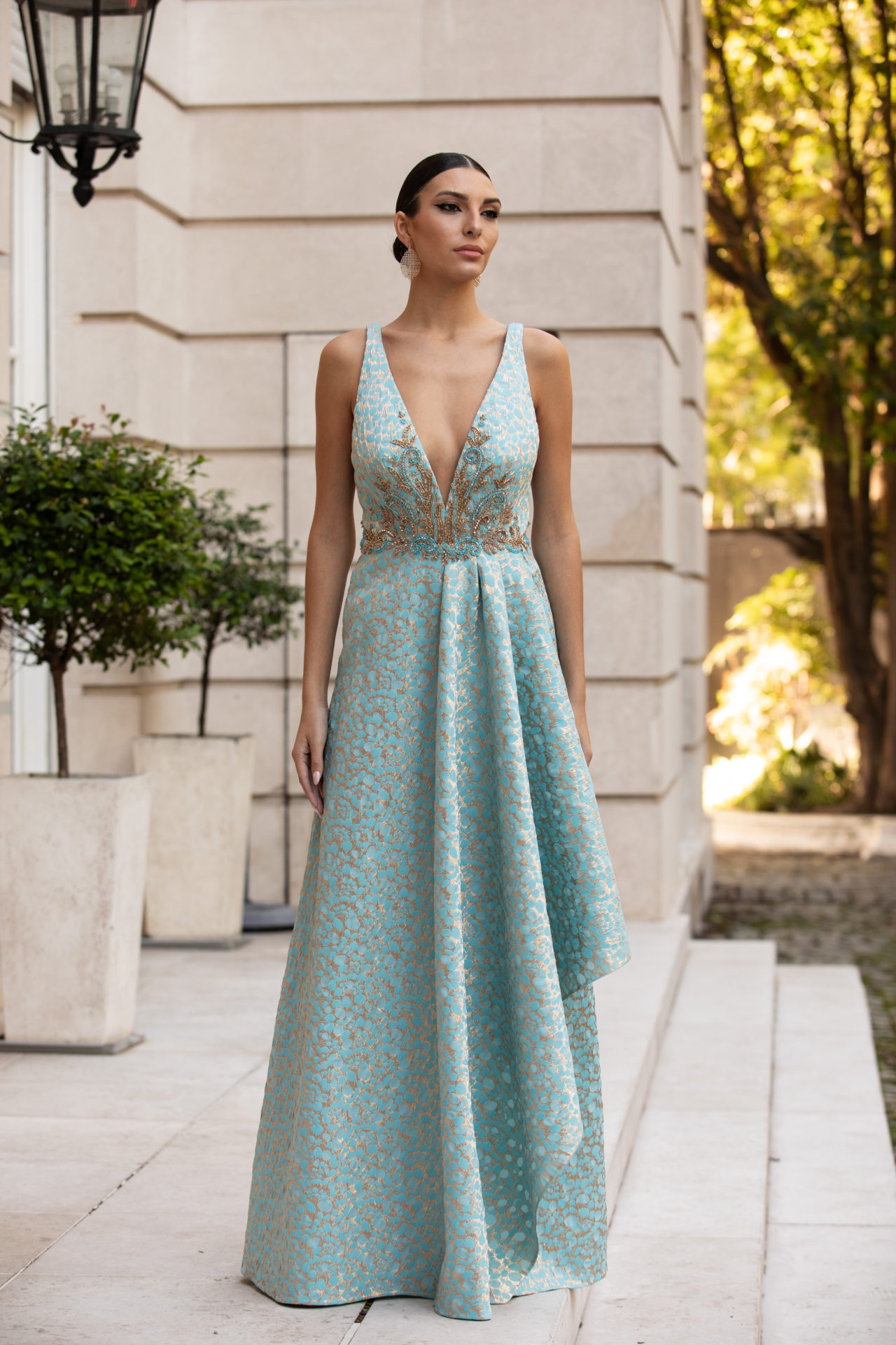 Cierra nuestro desfile una pieza nupcial romántica, embellecida con bordado tambour en tonalidades oro y marfil.