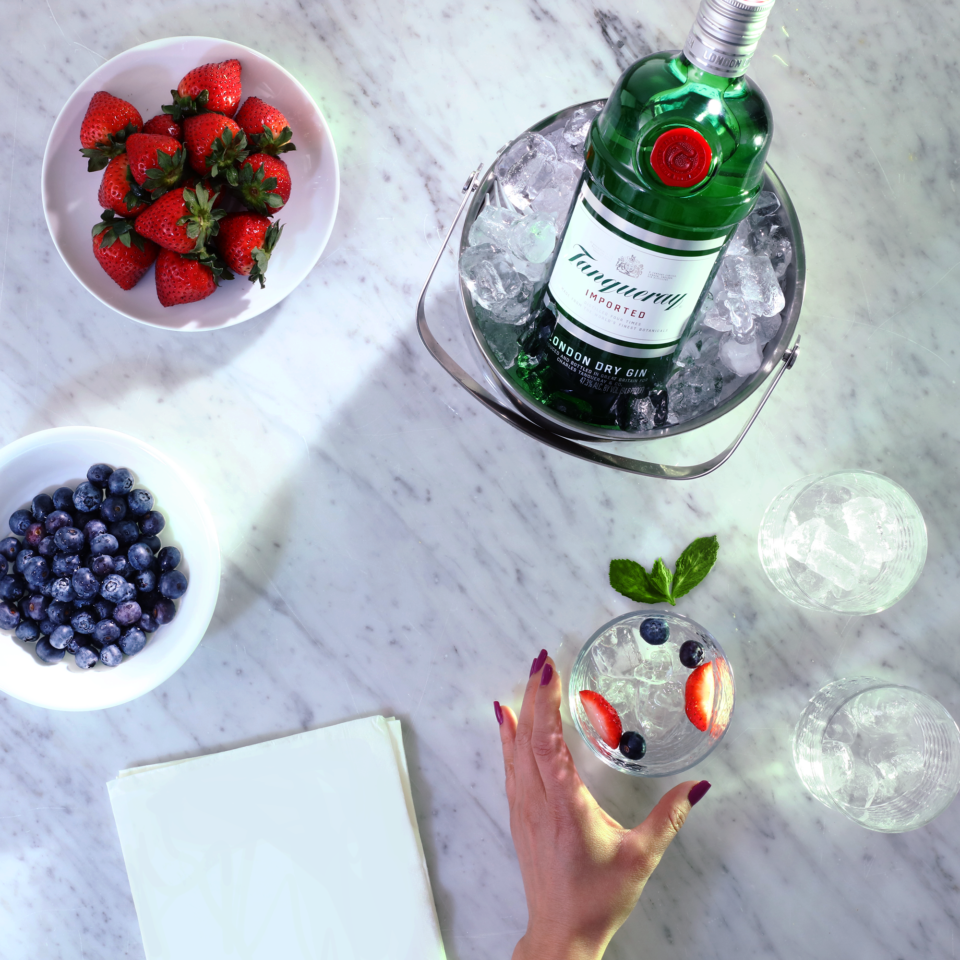 - En un copón o vaso alto, agregar 45ml de Tanqueray London Dry Gin, 20ml de jugo de limón, 20ml de almíbar y mezclar. Agregar hielo en cubos y rellenar el vaso con soda.