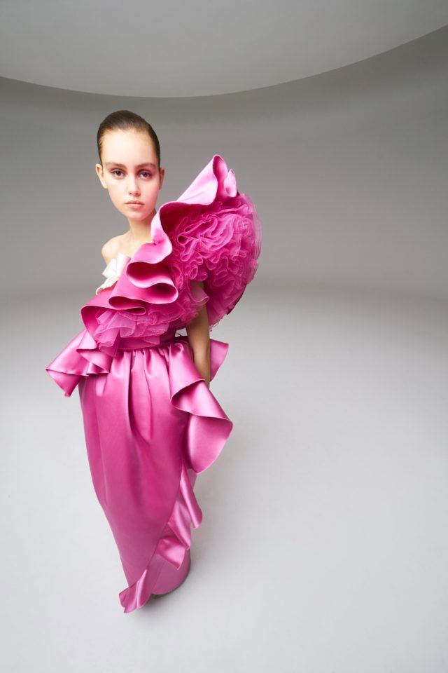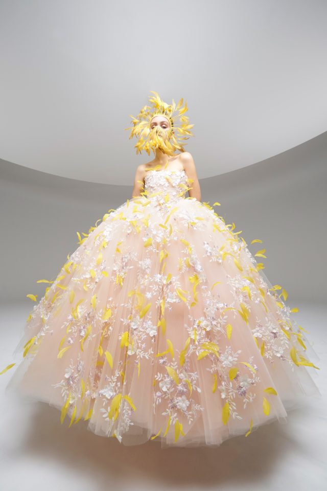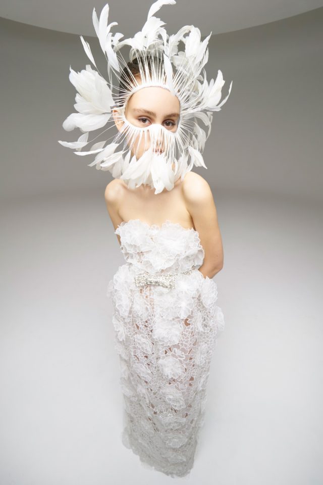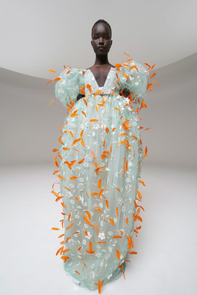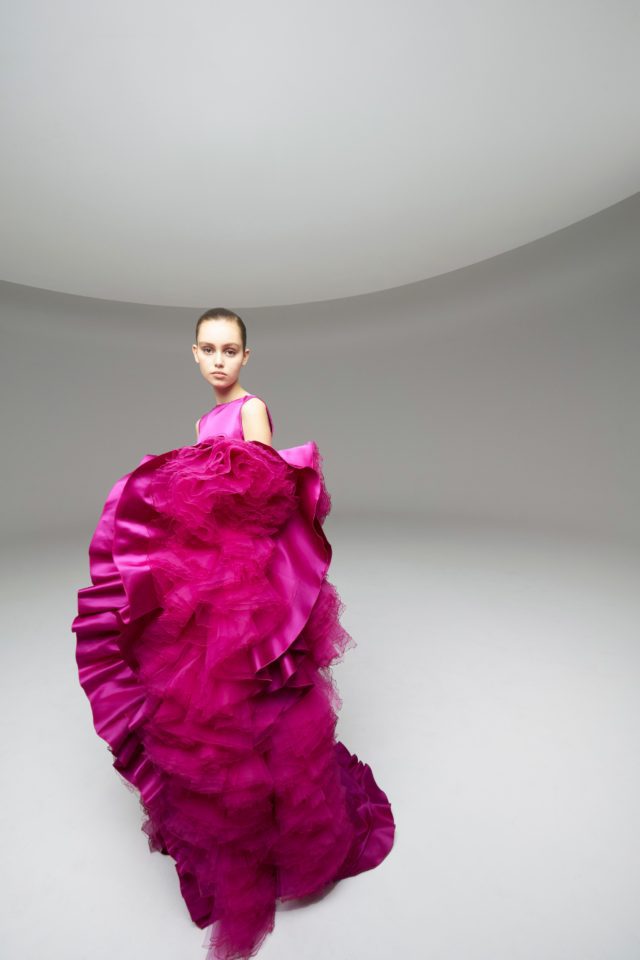 Giambattista Valli: Diseños repletos de kilómetros de tul que son marca de la casa, flecos extravagantes, lazos XL, máscaras carnavaleras y utilizando siluetas burbuja. La firma de moda ha sustituido su desfile de Alta Costura de primavera 2020 por una exposición abierta al público.