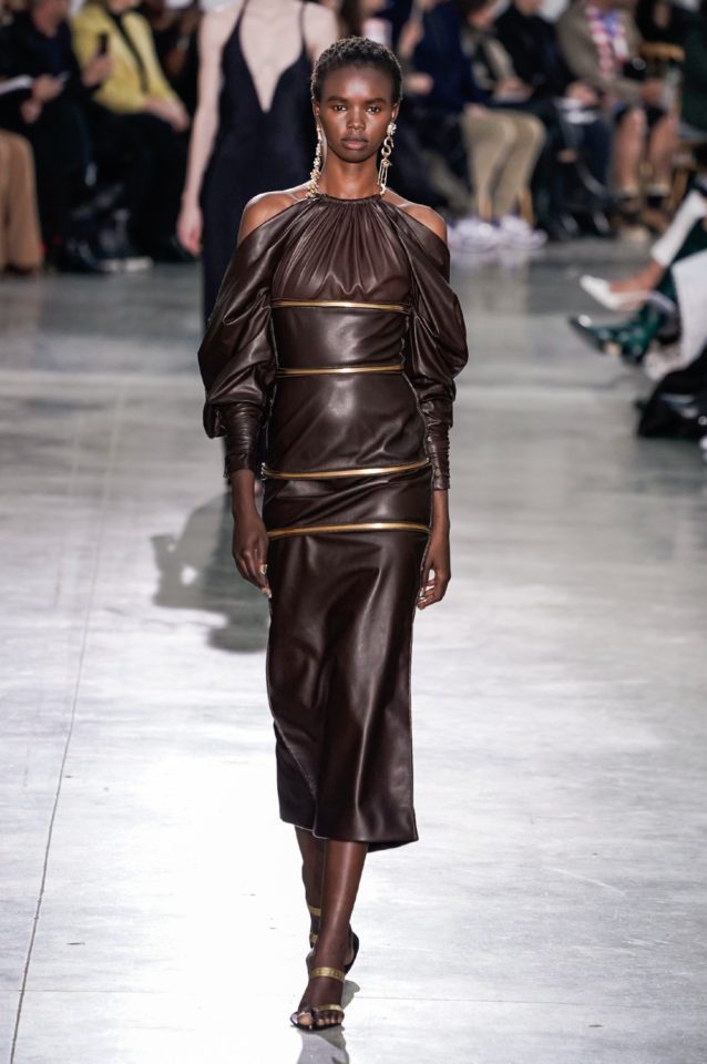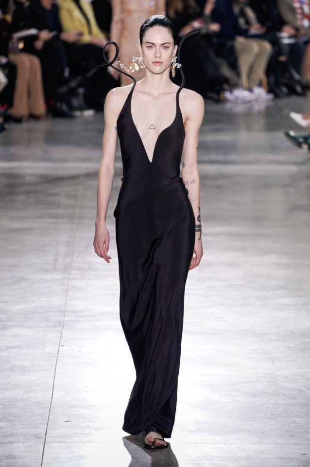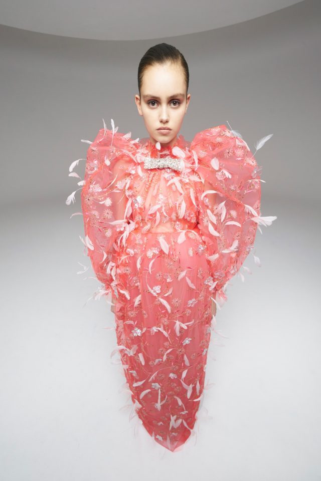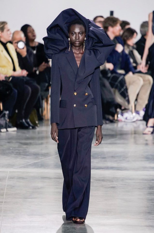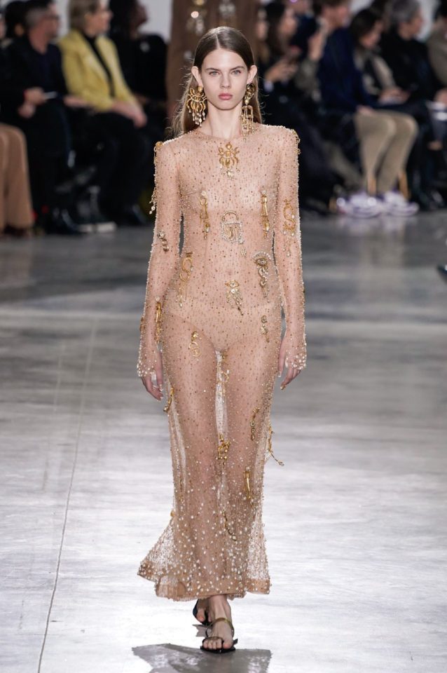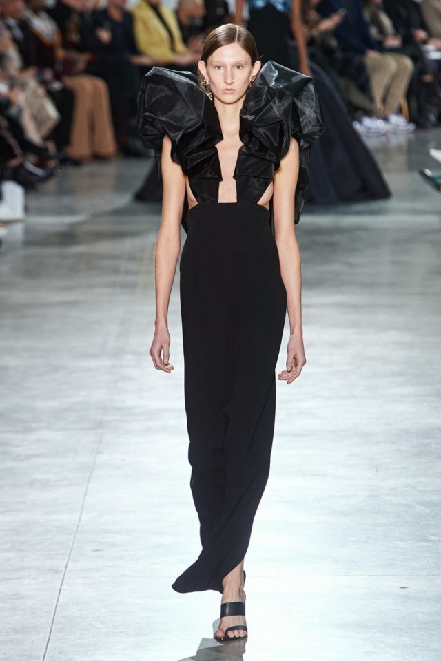 Schiaparelli: De la mano de su director creativo, Daniel Roseberry, la firma ha retomado las raíces surrealistas de la casa modernizando los códigos. Roseberry confirmó haber explorado las siluetas de Alberto Giacometti para la realización de esta colección buscando el dualismo de una mujer soñadora durante el día y seductora en la noche.