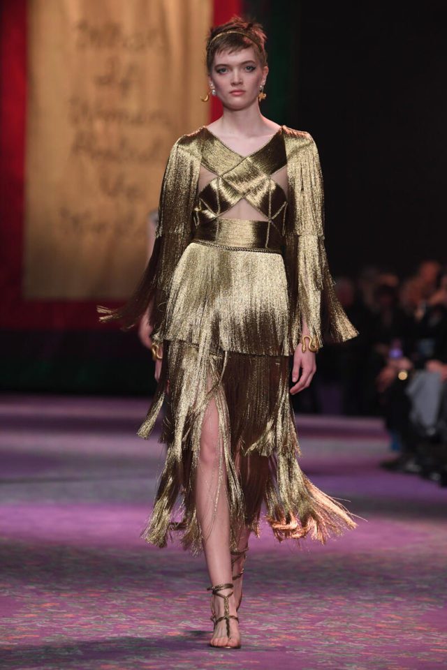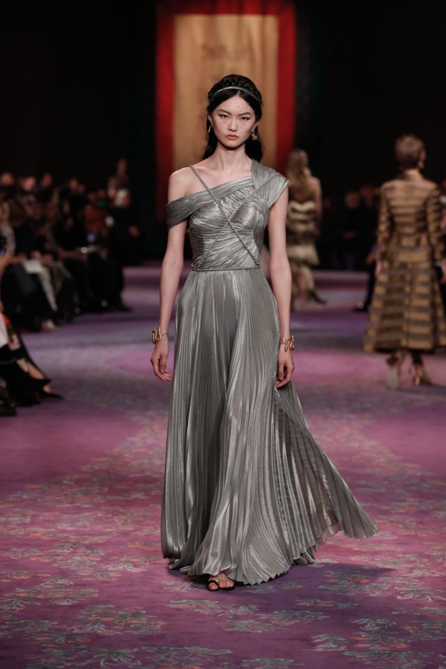 Dior: Plisados, transparencias y flecos en vestidos de inspiración grecorromana son la inspiración de esta colección ss2020. De la mano de la artista Judy Chicago, se crea «la divinidad femenina». «Qué pasaría si las mujeres dominaran el mundo? « esa fue la pregunta que la diseñadora Maria Grazia Chiuri y Judy, plantearon a la hora de realizar la cápsula.
