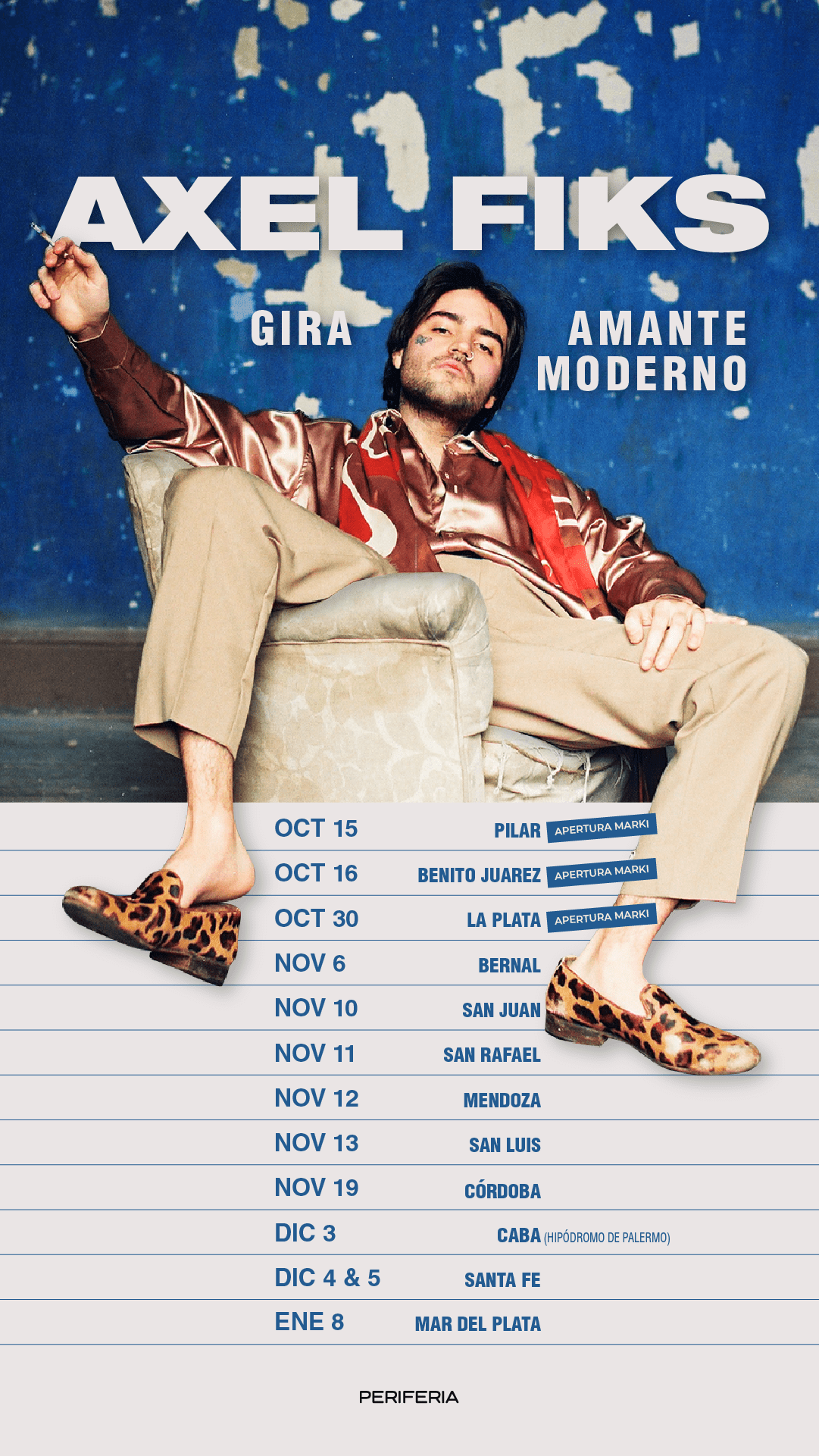 Axel Fiks presenta su primera gira por el país para presentar “amante moderno”, su reciente trabajo discográfico. En Buenos Aires lo tendrá como protagonista el 3 de diciembre en el Hipódromo de Palermo, así como también recorrerá Mendoza, Córdoba, San Luis y Santa Fe.
