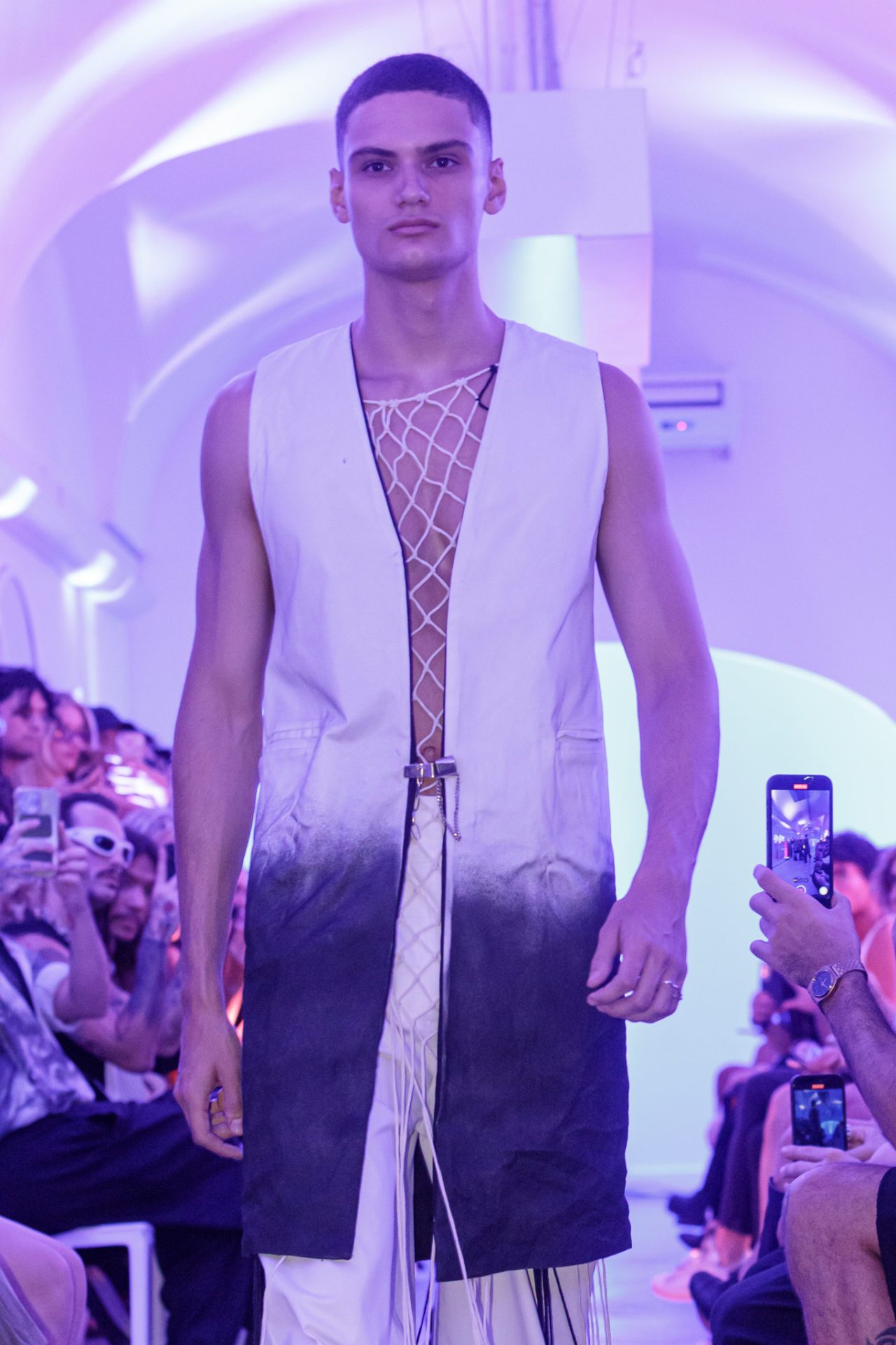 R3N4C3R, su colección que parte de la base de un poema que el autor redactó a modo de catarsis, donde expresa muchas cosas como encontrarse a sí mismo, estar orgullosos de lo que somos, más allá del qué dirán. La paleta de color es negro, plata y blanco, las cuales hacen un mix perfecto para mostrar la transición hasta llegar a renacer. En la colección se manejan diferentes tipologías, partiendo de prendas oversize ‘no gender’, texturas experimentales, estampados en alto relieve y layers.