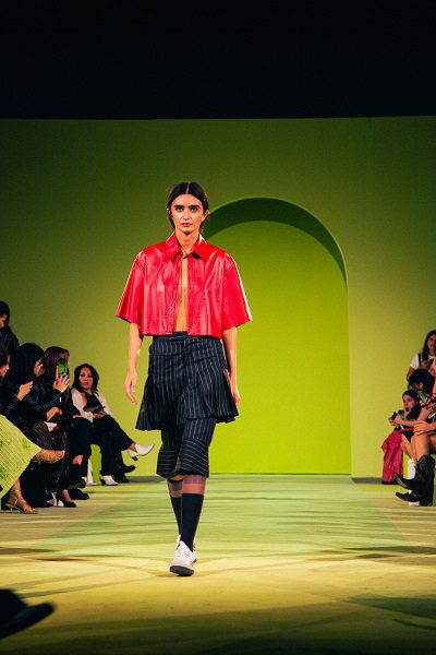 El cierre del martes estuvo a cargo de Helena Dakak (ganadora del concurso de diseño de autor BA del año 2023). En una llamativa instalación verde en LABA, exhibió DICOTOMÍ.A partir de siluetas netas, Helena, nos acerca a su realidad actual, a su entorno, a su infancia, a aquello que compuso su ADN, a vivencias en su Salta natal que la formaron y quedaron inscriptas como destellos de color que se acentúan y se pierden. Los volúmenes tipo A predominaron en mangas y faldas, los tonos rojo, celeste, azul, lila y verde protagonizaron las prendas, también se vió textiles a rayas y combinación de varios colores en una misma prenda.