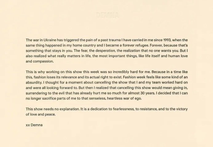 «Es por eso por lo que trabajar en este desfile esta semana ha sido tan increíblemente duro para mí», se excusó Demna en su carta. «Porque en un momento como este, la moda pierde su relevancia y su derecho de existir. La semana de la moda suena a algo parecido al absurdo. Pensé durante un momento en cancelar el desfile en el que tanto yo como mi equipo hemos trabajado tan duro y que estábamos deseando que sucediese. Pero luego me di cuenta de que cancelar este desfile significaría ceder, rendirme al demonio que ya me ha hecho tanto daño durante los últimos 30 años. He decidido que no puedo seguir sacrificando partes de mí por esa guerra de ego sin sentido y sin corazón», prosiguió.