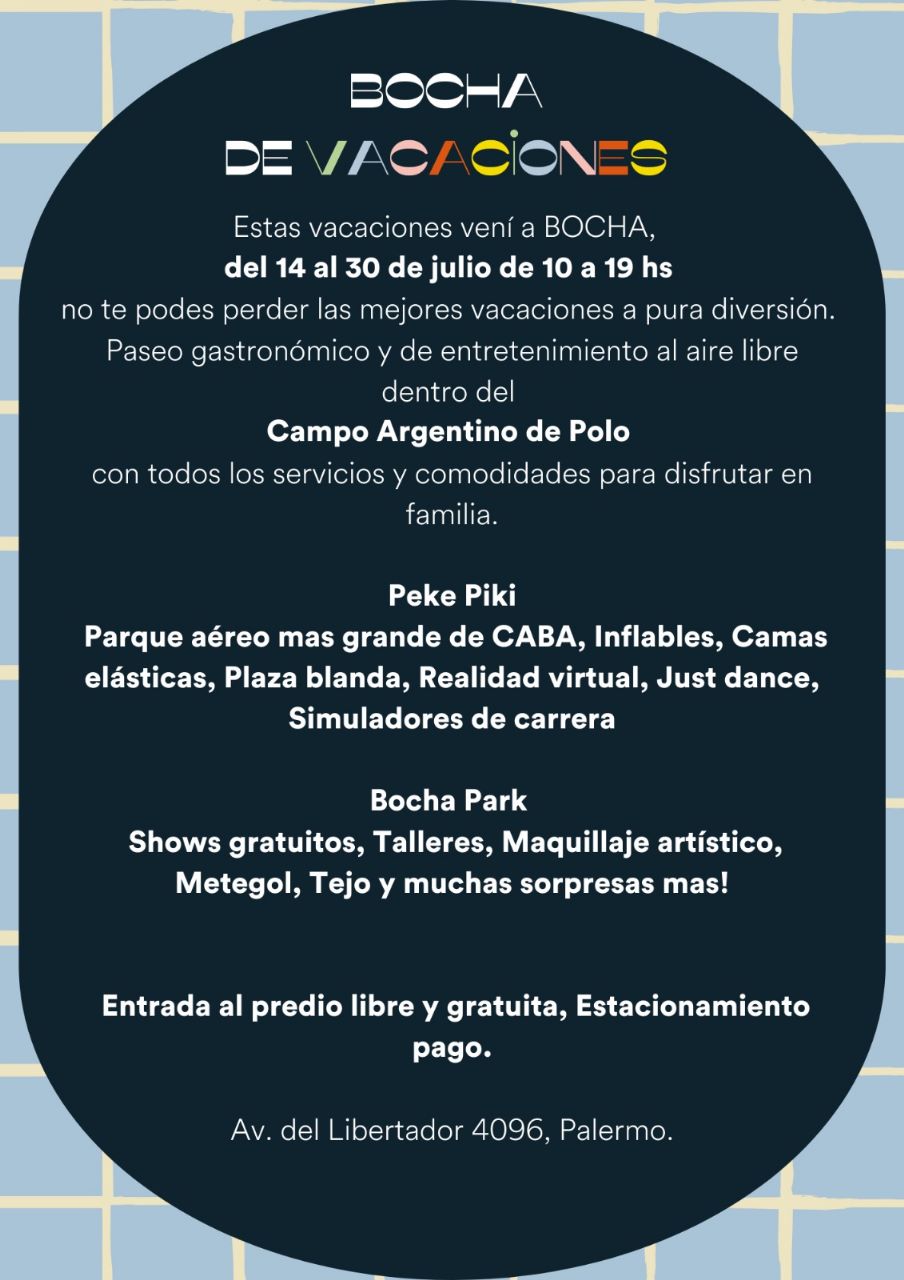 Del 14 al 30 de julio, de 10 a 19 horas, BOCHA contará con una programación especial, con shows y talleres preparados para disfrutar en familia a lo largo de estas semanas de vacaciones. La entrada al predio es libre y gratuita, y el ingreso será por Av del Libertador 4096, en el barrio de Palermo.
