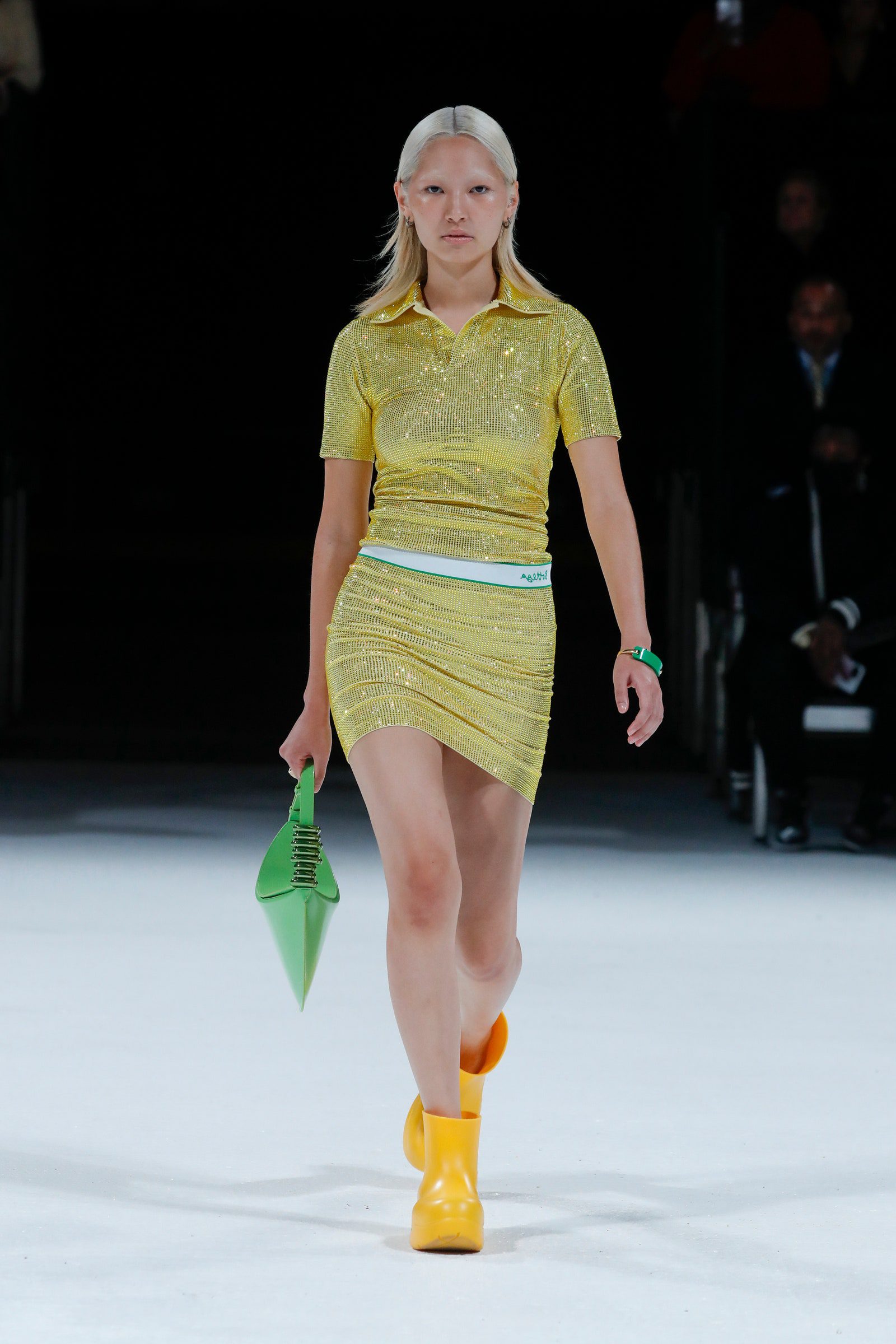 El brillo se hizo presente desde tejidos de punto relucientes o vestidos con grandes lentejuelas hasta conjuntos de pantalones en tejido plateado metalizado o verde para dar un efecto espacial, pasando por otros tejidos brillantes, esmaltados o translúcidos.