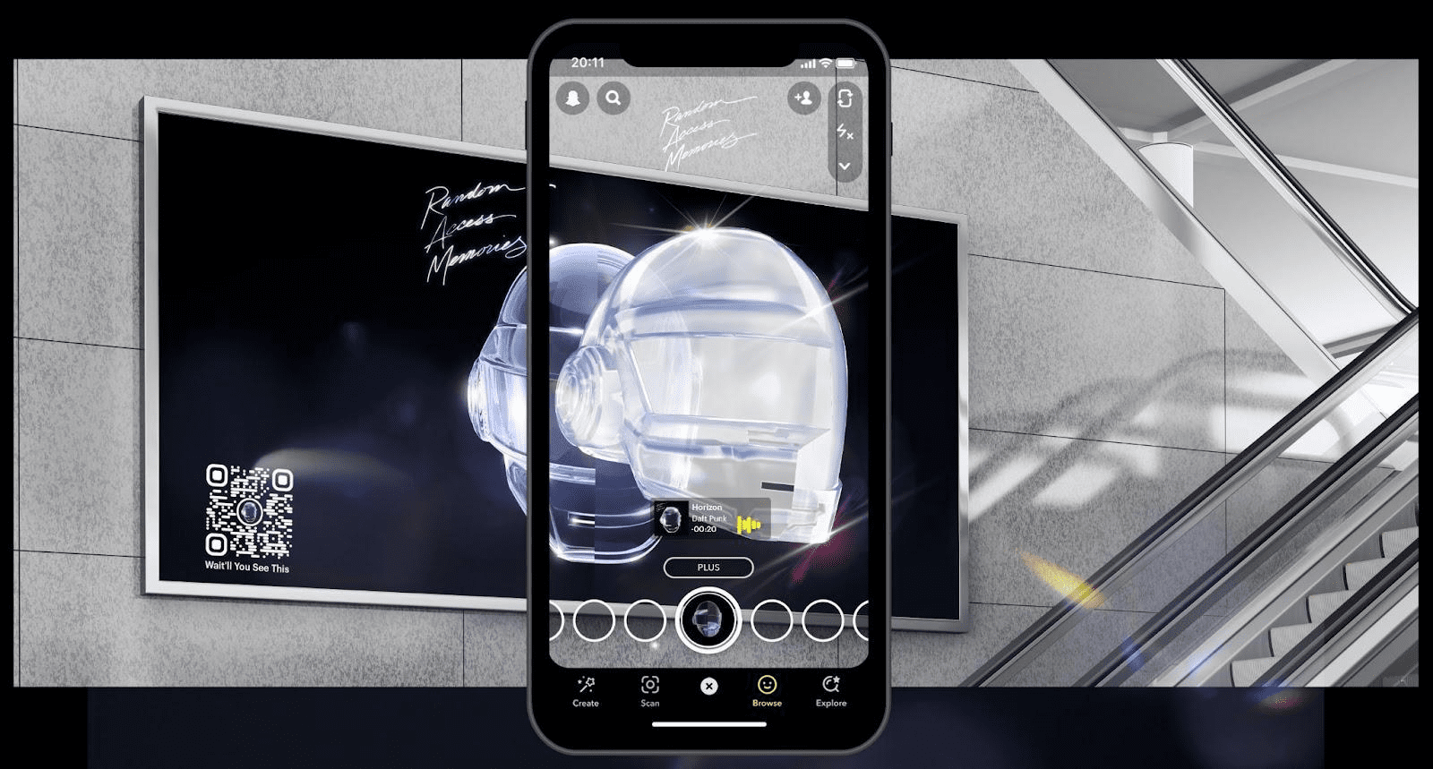 Los fans y los Snapchatters podrán acceder al Lente de Realidad Aumentada con el casco de cristal tamaño gigante encima del disco mientras «Horizon» comienza a sonar de fondo. Además, al girar la cámara, se podrá probar el casco y convertirte en un integrante de Daft Punk para mostrarlo en sus historias o en Spotlight.