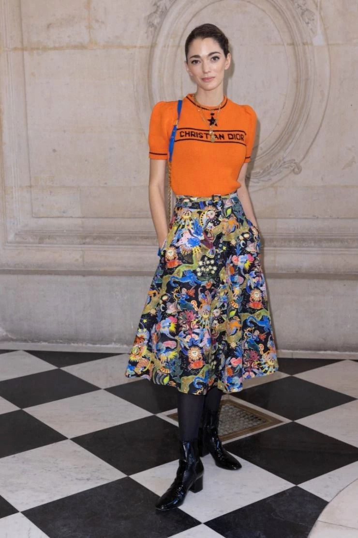 La argentina Sofia Sanchez Betak deslumbró con su estilo súper chic. Eligió una remera tejida de color naranja con logo y una falda evaseé con colorida estampa de flores.
