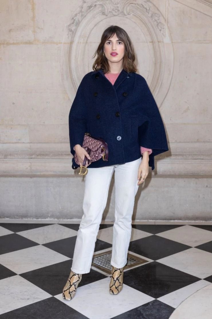 Jeanne Damas eligió un look al minimalismo que elevó con accesorios muy llamativos. La fundadora de Rouje eligió un abrigo de capa navy, pantalones blancos de corte recto, unas botas con taco de piel de serpiente y un bolso Saddle con el estampado de logo Dior Oblique en color rojo.