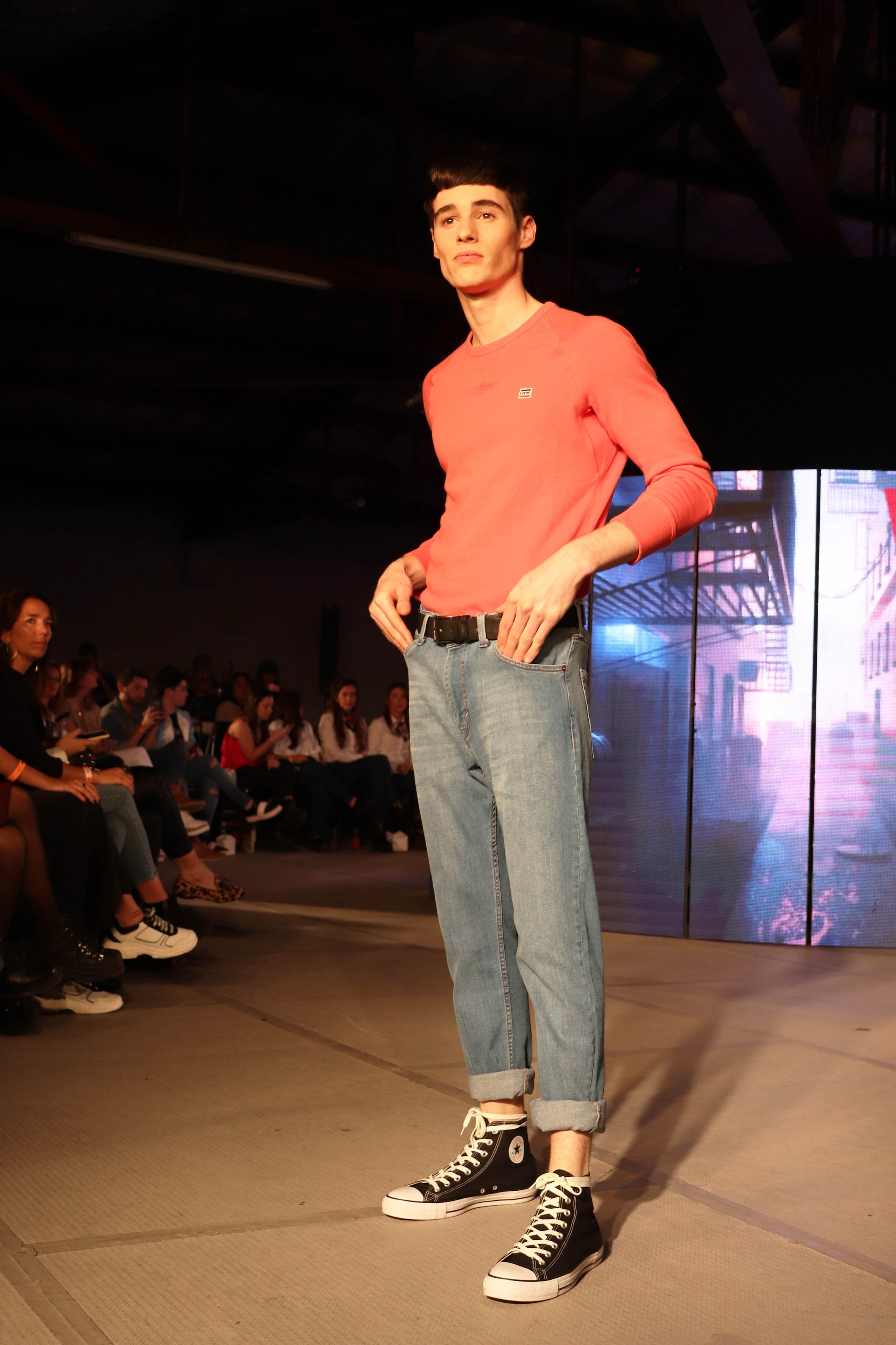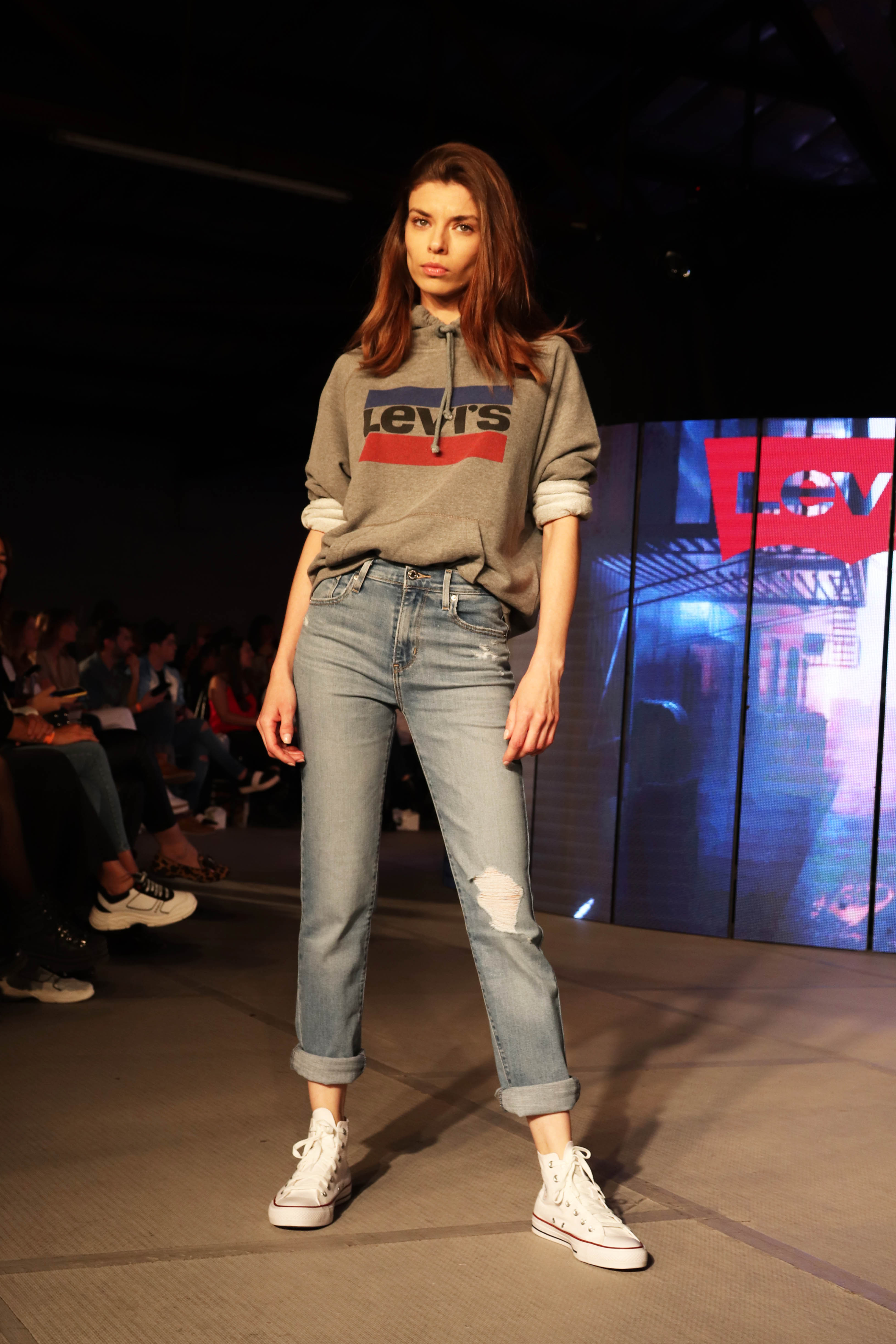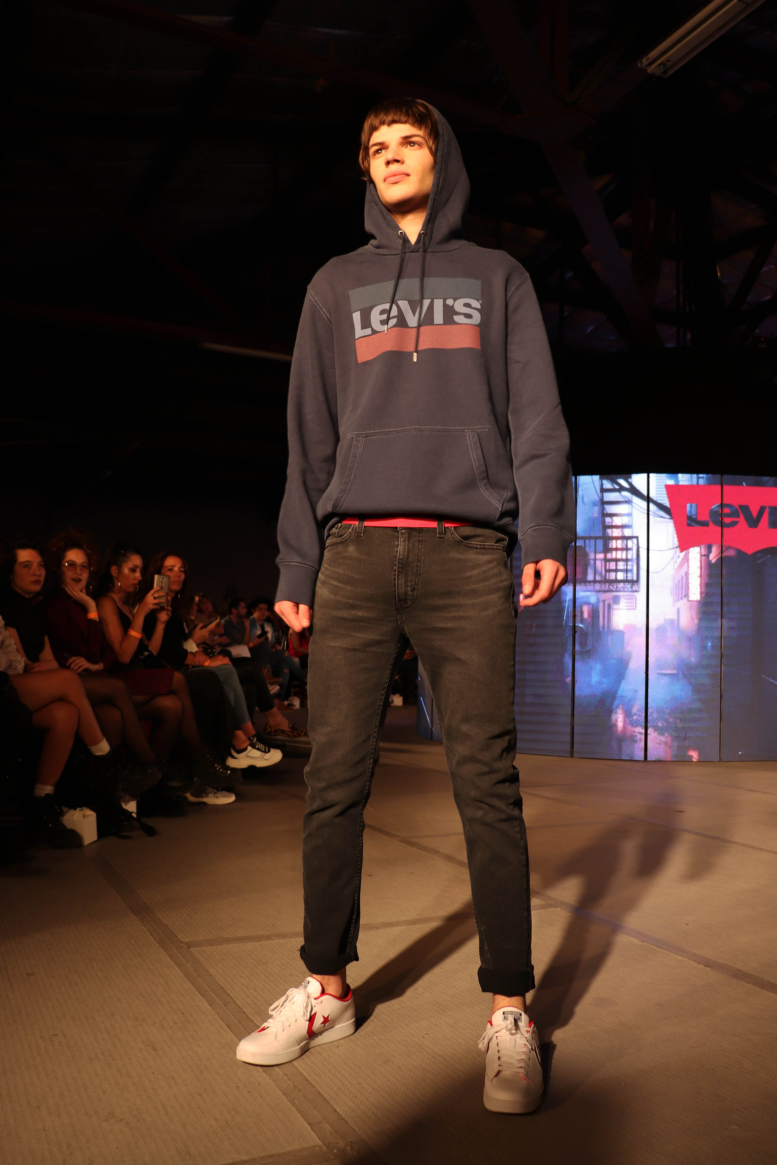 La marca Levis optó por mostrar aquellos looks que le dieron fama. Para ello decidieron usar las típicas remeras clásicas y buzos en tonos gris, azul, blanco y negro; los jeans y zapatillas de lona. Como siempre, presentaron estilos total denim.