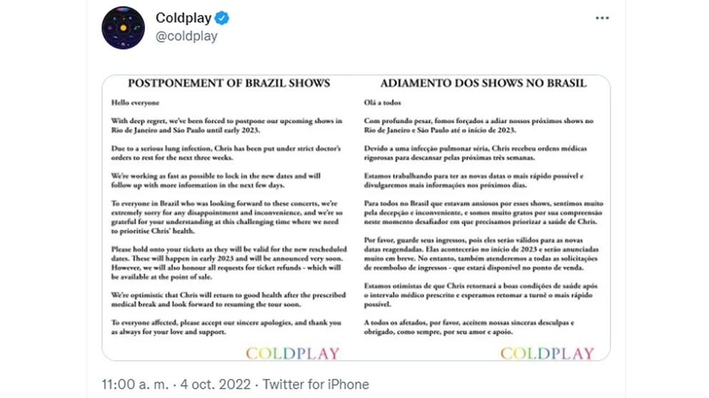 Allí se informa que Martin, de 45 años, presenta “una afección pulmonar grave”, y que por tal motivo “deberá estar cuidado estrictamente por médicos durante las próximas tres semanas”. Como su salud es prioridad, claro está, la banda se ve “forzada” a “posponer los shows” -un total de ocho- en San Pablo y Río de Janeiro. No obstante, los nuevos días para los espectáculos postergados no fueron definidos.