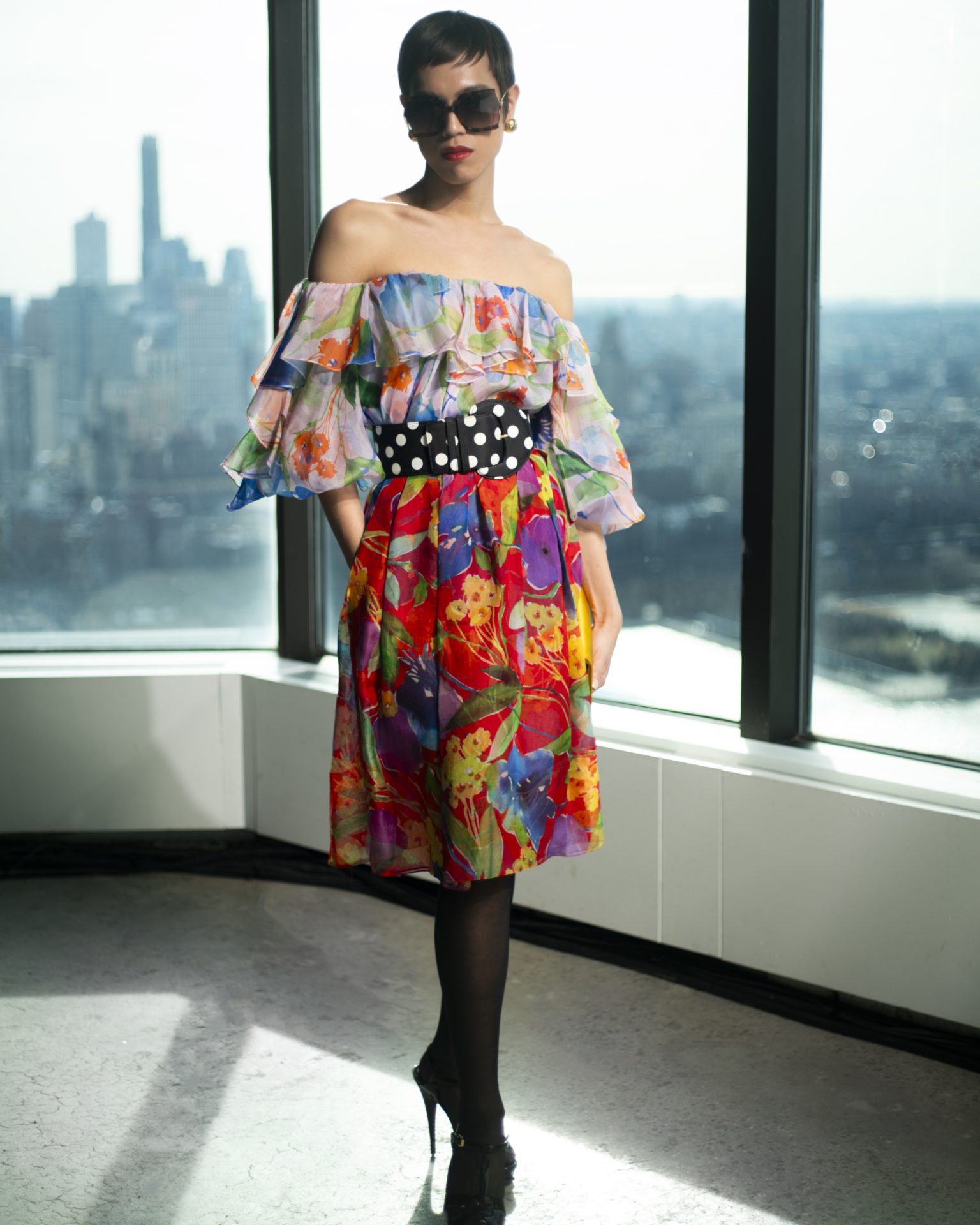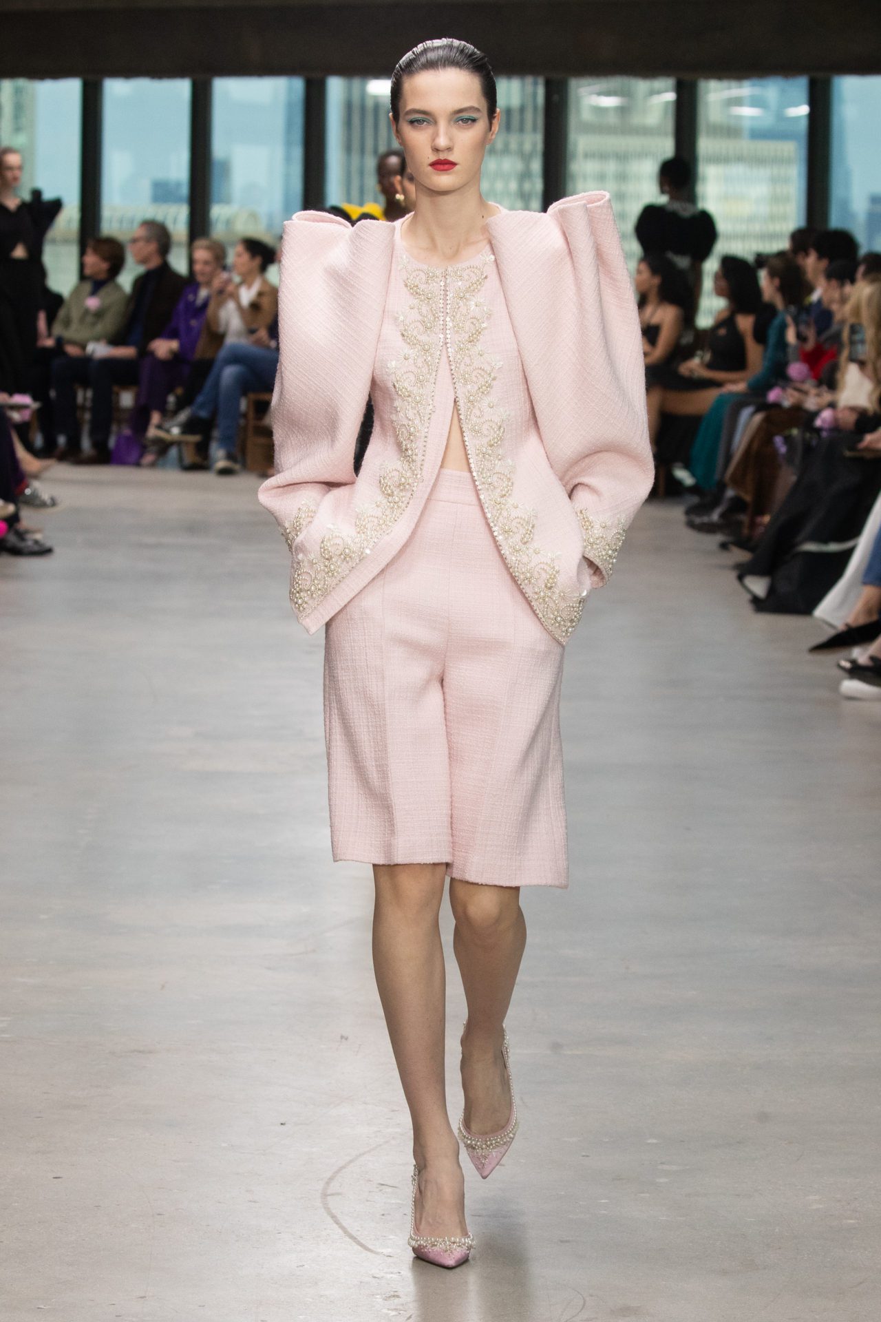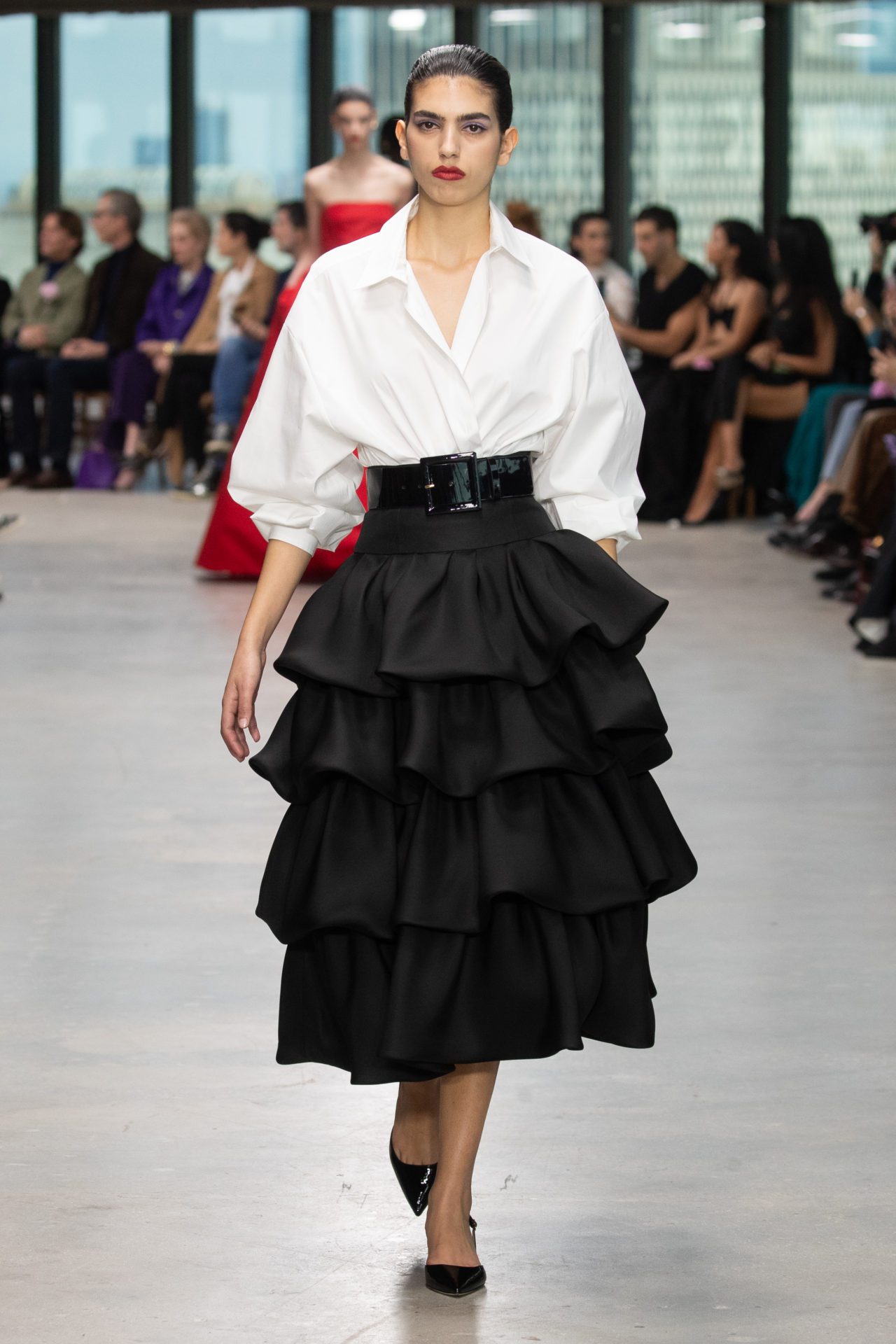 Las siluetas son marcadas, precisas y limpias. Los volantes resultan ondulantes y arquitectónicos a la vez. Los adornos se integran mediante el tejido, las cuentas y los bordados. Me obsesiona la artesanía.