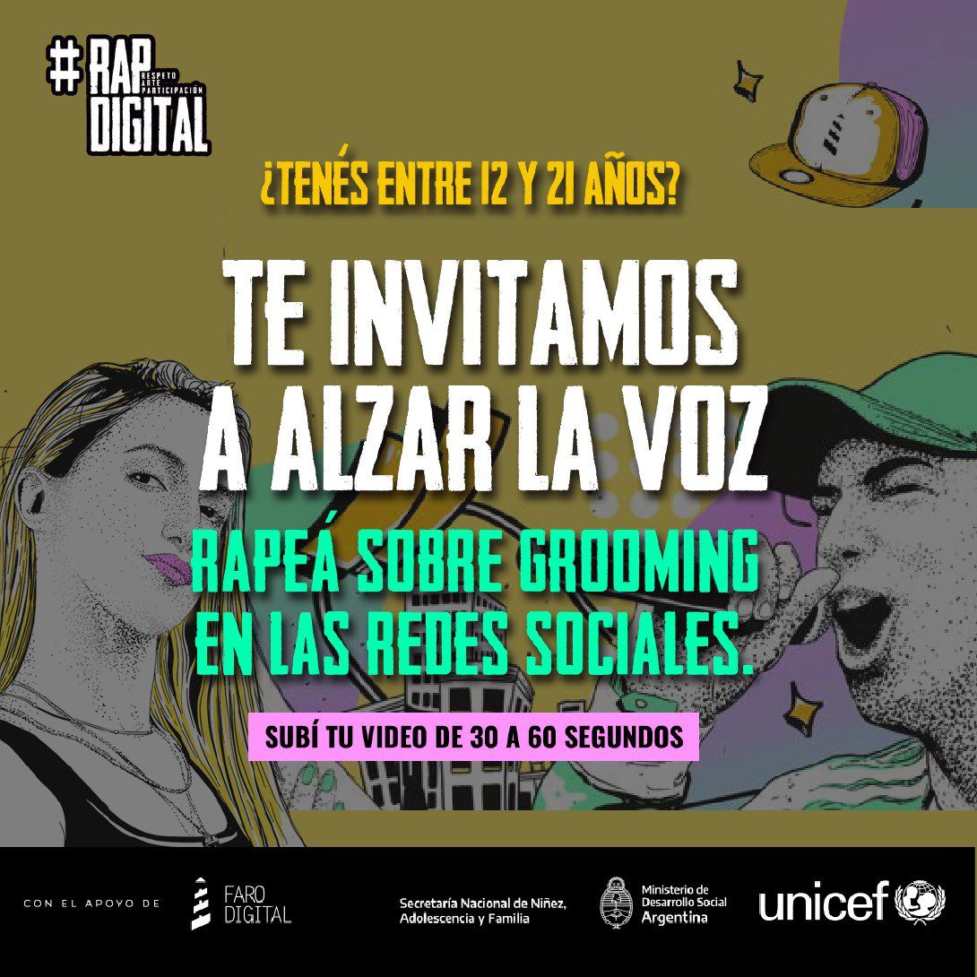Los raperos y raperas de Argentina tienen una nueva oportunidad para dar a conocer su obra: RAP Digital, el concurso que invita a las y los adolescentes a alzar la voz para alertar sobre los riesgos del mundo online, abre las inscripciones a su cuarta edición. Organizado por UNICEF, y con el apoyo de la Secretaría Nacional de Niñez, Adolescencia y Familia (SENAF) y la Asociación Civil Faro Digital, la iniciativa buscará este año concientizar sobre el grooming en Internet. Pluzito y Taty Santa Ana serán el padrino y la madrina esta temporada.