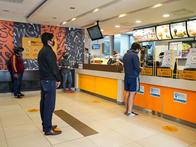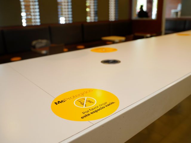 Es un sistema que tenemos no sólo en Córdoba, sino en todos los países de Latinoamerica. La idea es poner en primer lugar a la persona, trabajador -cliente y sus protecciones. Los puntos principales para conocer esta metodología es a través de la experiencia del cliente. Cuando el cliente llega tiene marcado el piso cada 2 metros por si es necesario hacer fila, cuando entras al local, tenemos un anfitrión que te guía, te invita a sanitizarte a suela del zapato, a ponerte alcohol en gel en las manos y te toma la temperatura. Luego de eso, te indica para donde quieras ir. Por un lado, la zona de cajas en donde están stickers amarillos de Mc Protegidos en el piso para continuar con el distanciamiento o directamente ir a los kioskos digitales. En la zona de entrega es exactamente igual,pero en la zona de cajas algo muy importante es que fomentamos el pago con tarjetas para evitar demasiado contacto.