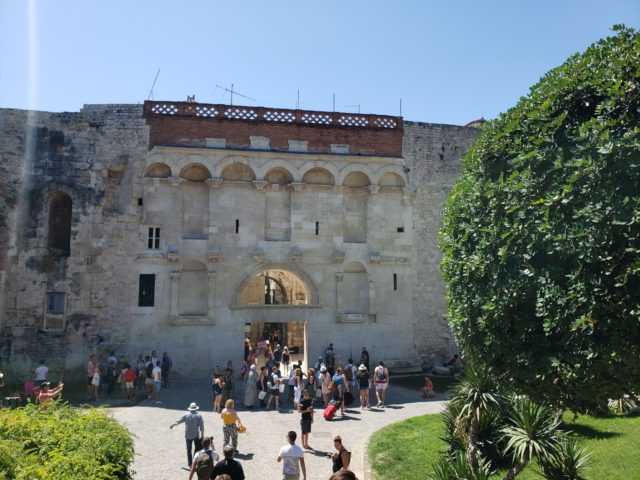El palacio es enteramente peatonal por lo cual si bien hay mucha gente a toda hora es muy fácil moverse. Ingresando por la puerta de Bronce (la que da al mar) uno se introduce al palacio por donde antes ingresaban las mercaderías. Allí ahora entre columnas y paredes de piedra hay un pequeño mercado de piedras y joyas, saliendo al patio nos encontramos con lo que se llama el Peristilo, antiguamente parte de las recamaras reales y a un costado de la Catedral de Split. Allí en ese espacio al aire libre hay un café que atiende en pequeños almohadones sobre las escalinatas y un espectáculo cada hora donde actores vestidos de soldados romanos y del Emperador y la emperatriz se asoman al atrio a saludar al “pueblo” presente.
