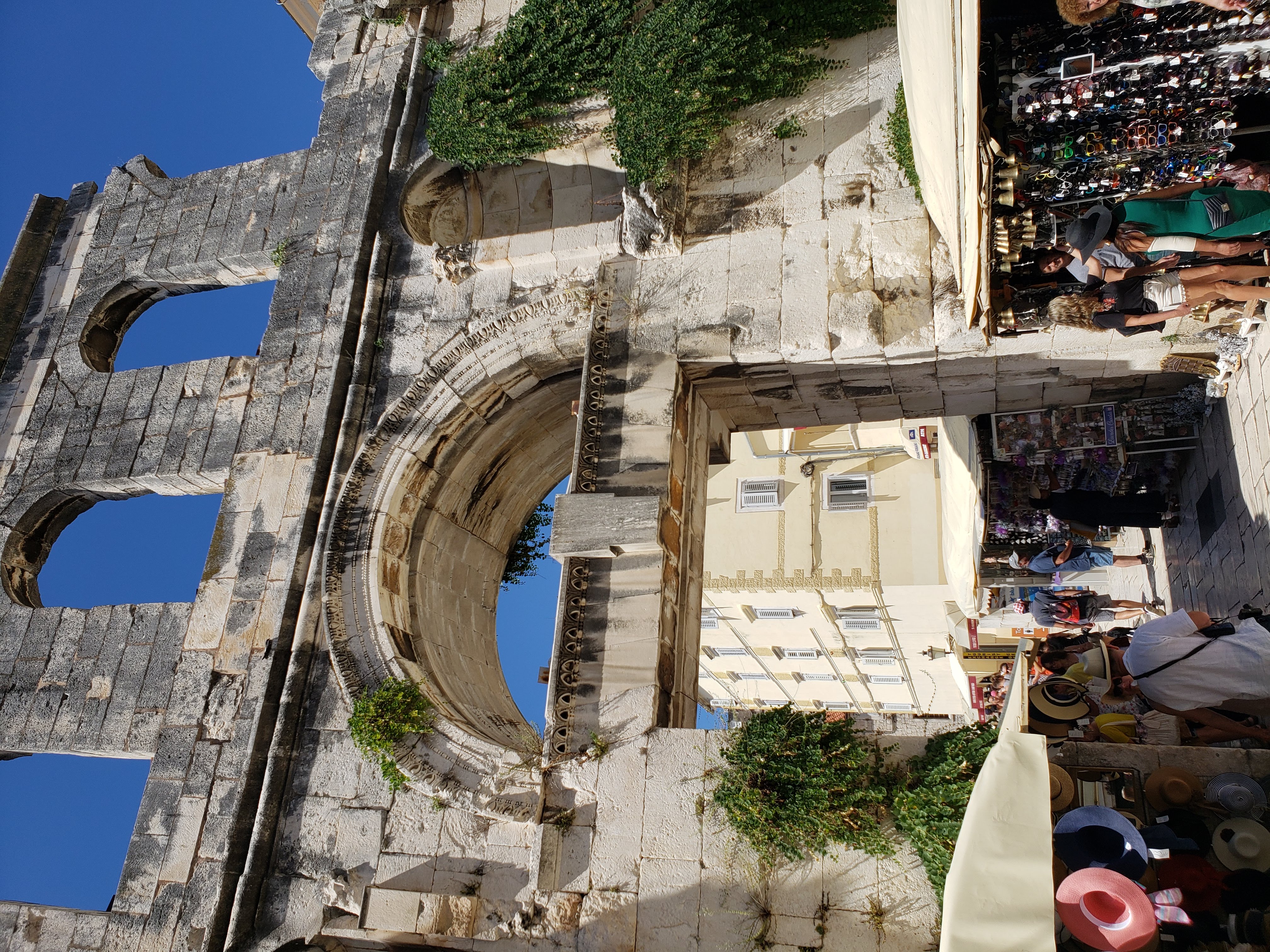 El palacio es enteramente peatonal por lo cual si bien hay mucha gente a toda hora es muy fácil moverse. Ingresando por la puerta de Bronce (la que da al mar) uno se introduce al palacio por donde antes ingresaban las mercaderías. Allí ahora entre columnas y paredes de piedra hay un pequeño mercado de piedras y joyas, saliendo al patio nos encontramos con lo que se llama el Peristilo, antiguamente parte de las recamaras reales y a un costado de la Catedral de Split. Allí en ese espacio al aire libre hay un café que atiende en pequeños almohadones sobre las escalinatas y un espectáculo cada hora donde actores vestidos de soldados romanos y del Emperador y la emperatriz se asoman al atrio a saludar al “pueblo” presente.