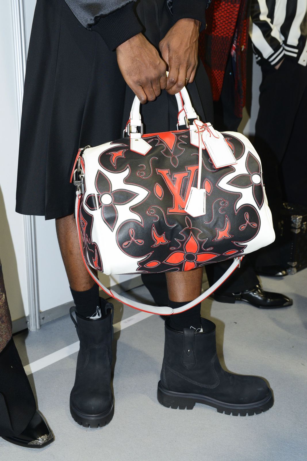 La colección estrena un nuevo bolso de asa termomoldeada concebido por Pharrell Williams. El Speedy aparece en matices de gema y en nuevas formas: como bolso de silla de montar con tachuelas junto con el Saumur; en Damier Navette Studs junto con el Steamer; y en tonos de Cowboy Boots Patchwork junto con la Pochette Accessoires XL. El Steamer se reintroduce en tres tamaños, incluida una silueta a gran escala de 65 cm. Un lienzo a cuadros de búfalo con infusión de Damier se presenta a través de siluetas con herrajes vaqueros. Los bolsos en Lienzo Monograma Envejecido, Monograma Cepillado y Damier Denim descolorido aparecen erosionados por el sol de la pradera. El estampado Damoflage evoluciona en matices naranja y eclipse, y en un Lienzo Cowmooflage bovino también interpretado en pelo de vaca. Las bolsas de cuero tallado adaptan las molduras de las sillas de montar. Las ediciones especiales incluyen bolsas para libros y herramientas, y bolsas Speedy y Steamer en cocodrilo Monogram plateado pintado a mano, Monogram avestruz y cocodrilo nubuck.