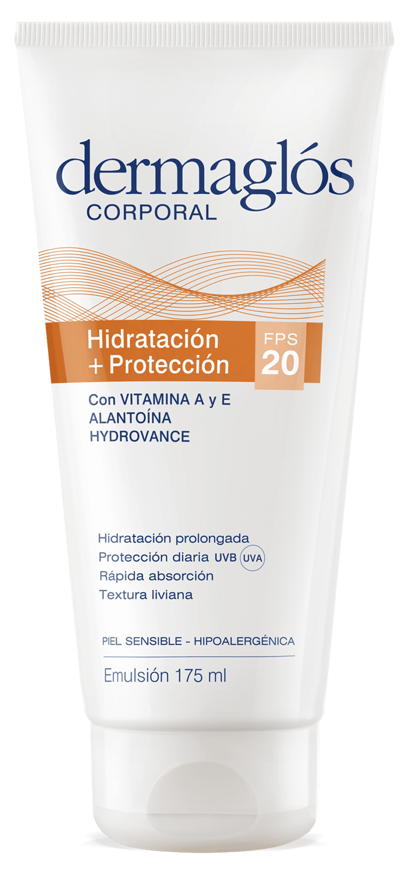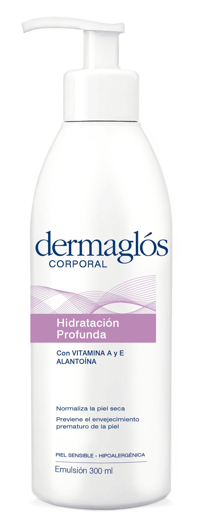 Dermaglós Hidratación Profunda. Hidrata y humecta en profundidad la piel seca, dejándola suave y saludable. Su fórmula con Vitamina A, E y Alantoína se absorbe hasta las capas más profundas de la piel de manera única. Composición: Vitamina A (100.000 U.I.), Vitamina E y Alantoína. Presentaciones: Crema x 100g y 200g (pote), Emulsión x 300 ml (frasco con bomba).