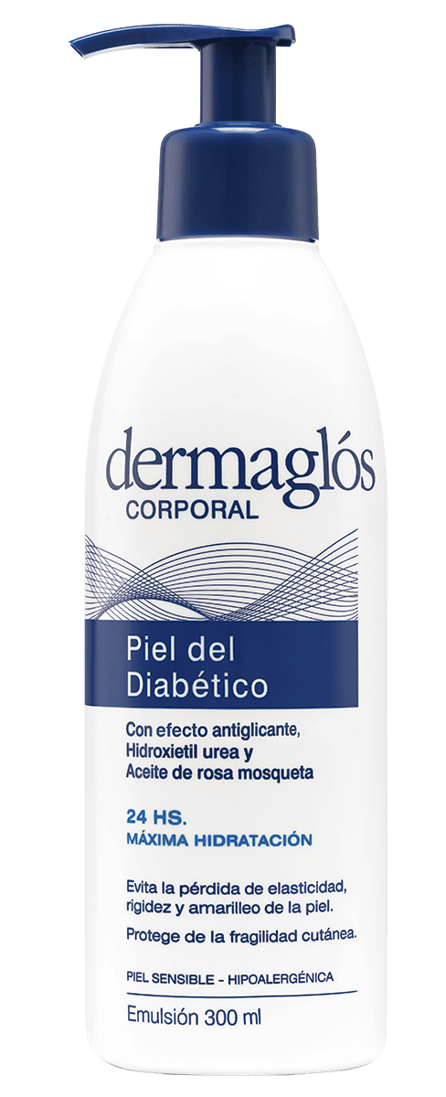 Dermaglós Emulsión Piel del Diabético**. Destinado a las piel sana de las personas con diabetes, con exclusiva fórmula. La misma otorga máxima hidratación y suavidad, ya que contiene una combinación de hidroxietil urea, aceite de rosa mosqueta, castaño de indias y efecto antiglicante que le dan a la piel una hidratación altamente eficaz, ya que disminuye la resequedad especialmente en codos y pies. Un aliado perfecto para el cuidado de la piel. Presentación: Emulsión x 300 ml (frasco con bomba), Emulsión x 50 ml (en pomo), y Crema x 100 gr. (pote).