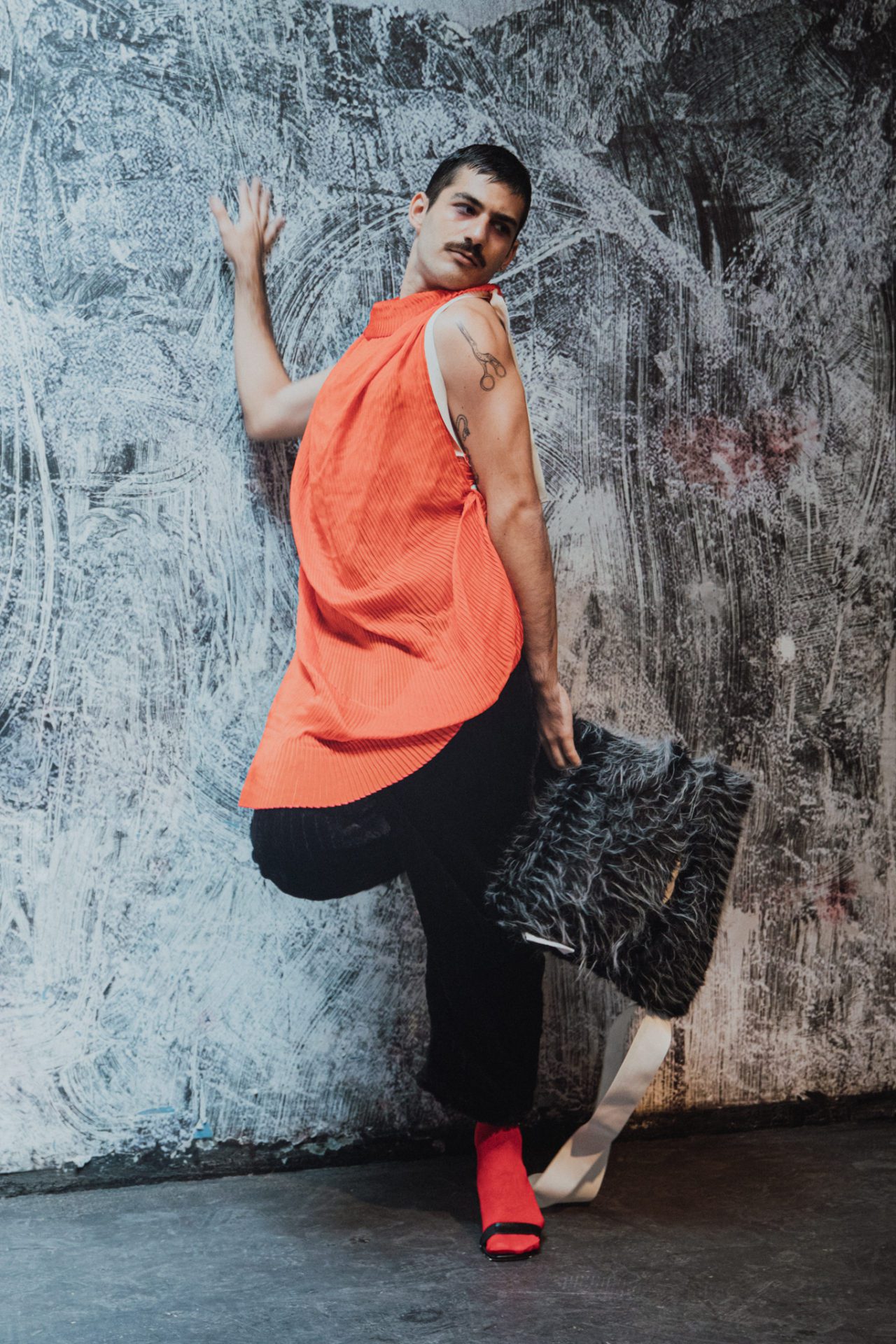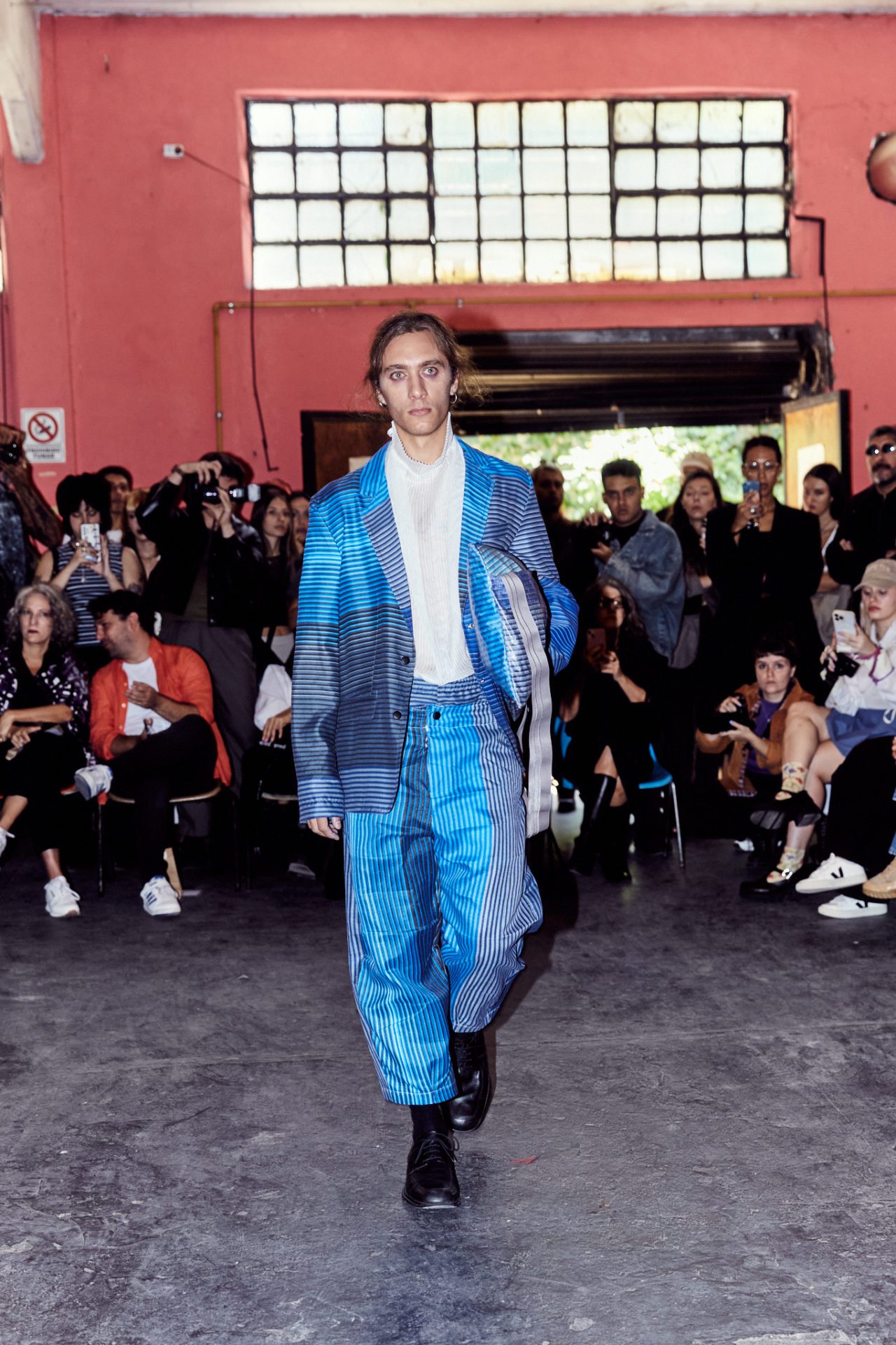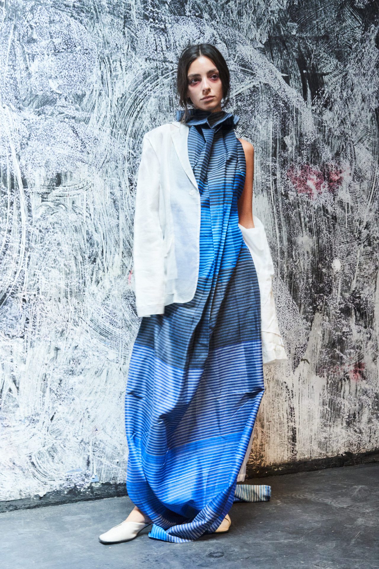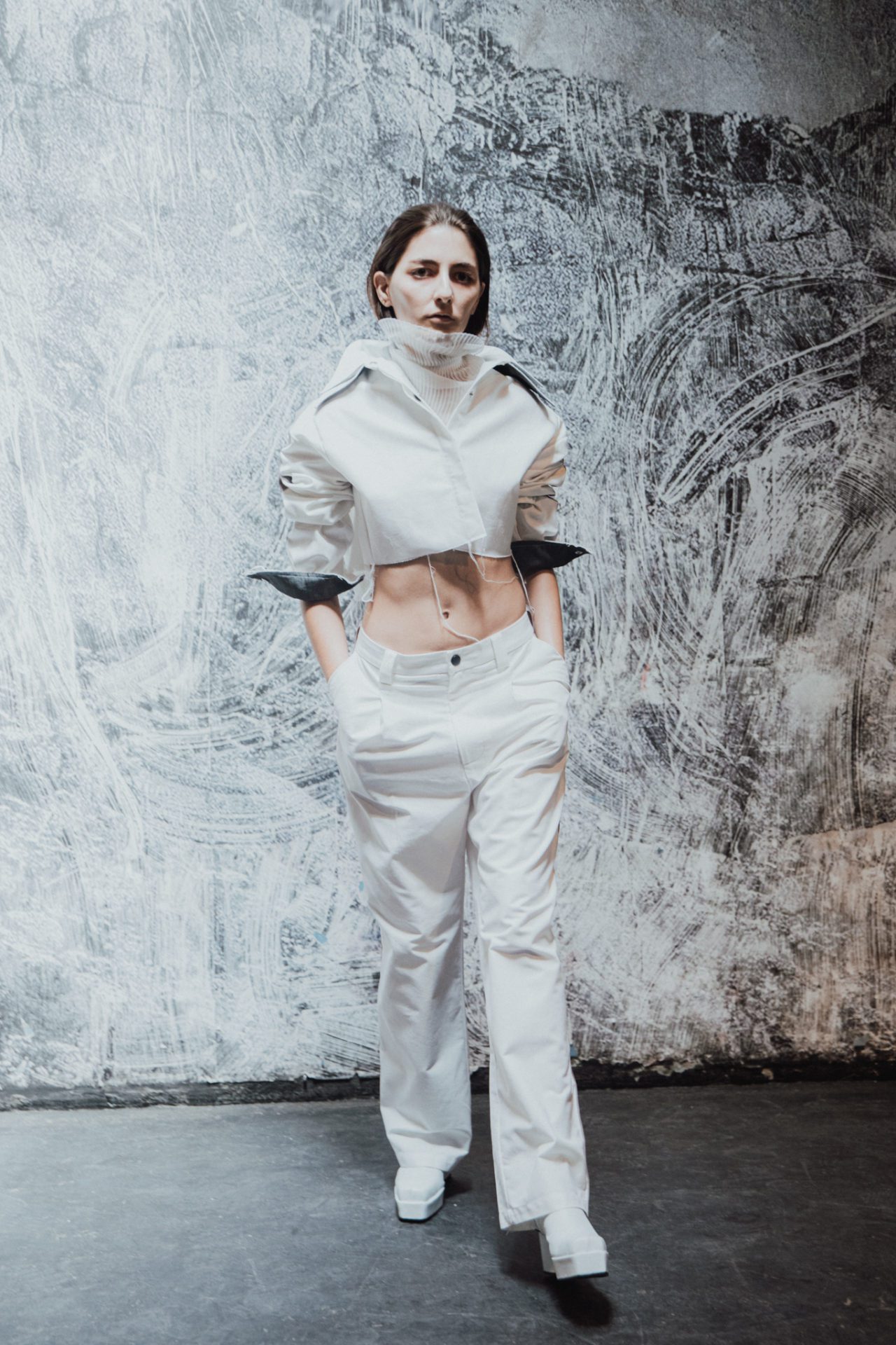 La diseñadora, que participa actualmente del concurso Diseño BA por una beca en Istituto Marangoni, se destaca por jugar con pliegues, tablas y plisados, en tonos blancos y negros, y toques de celeste, azul, rojo y naranja.