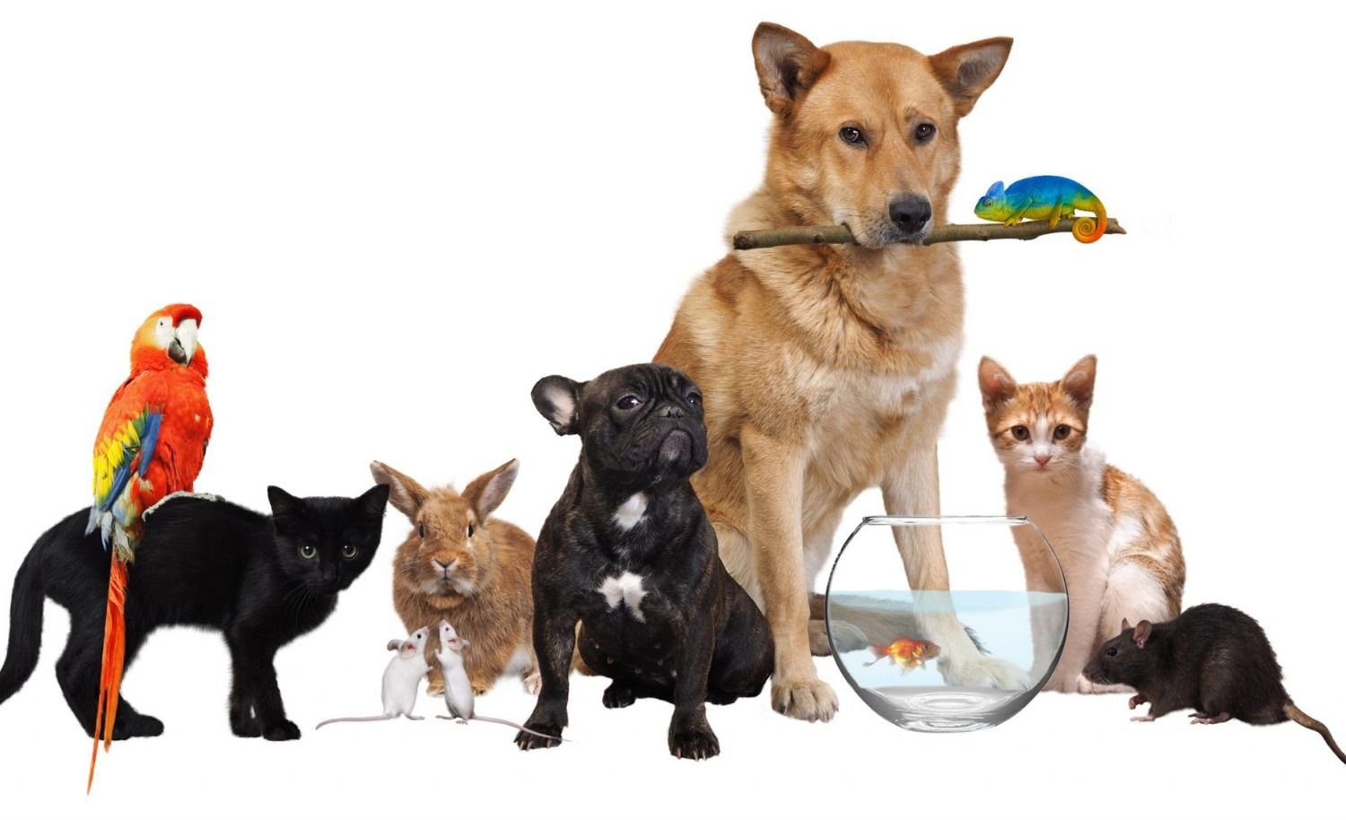 Group of common domestic animals together on white