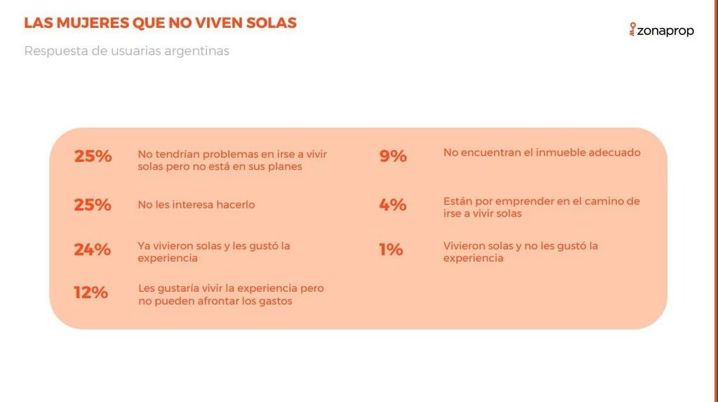 Las mujeres encuestadas que viven con hijos, pareja o familia, aseguran que no tendrían problema en irse a vivir solas, pero no está en sus planes (25%), a otras no le interesa hacerlo (25%) y por otro lado, algunas ya lo hicieron y les gustó la experiencia (24%). Un 12% le gustaría vivir la experiencia pero no puede afrontar los gastos, un 9% no encuentra el inmueble adecuado y un 4% está por emprender este camino. Solamente un 1,3% vivió sola en algún momento y no le gustó hacerlo.