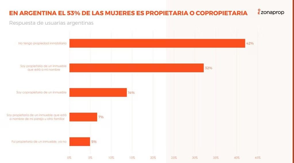 En Argentina, este número es del 53%, mientras que un 42% indica que no cuenta con propiedades a su nombre y un 5% fue propietaria en su momento pero ya no lo es. A la hora de consultarles cómo fue que accedieron a comprar su propiedad, el 28% lo hizo en conjunto con su pareja, el 22,3% con sus propios ahorros, el 22% lo heredó, el 18% fue con la ayuda de un crédito hipotecario y el 9% lo hizo en conjunto con sus padres u otro familiar.