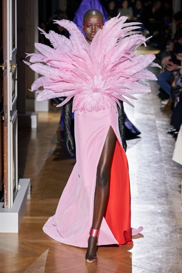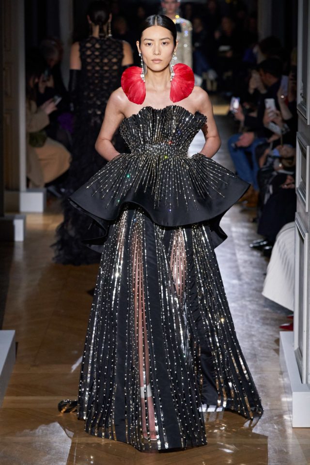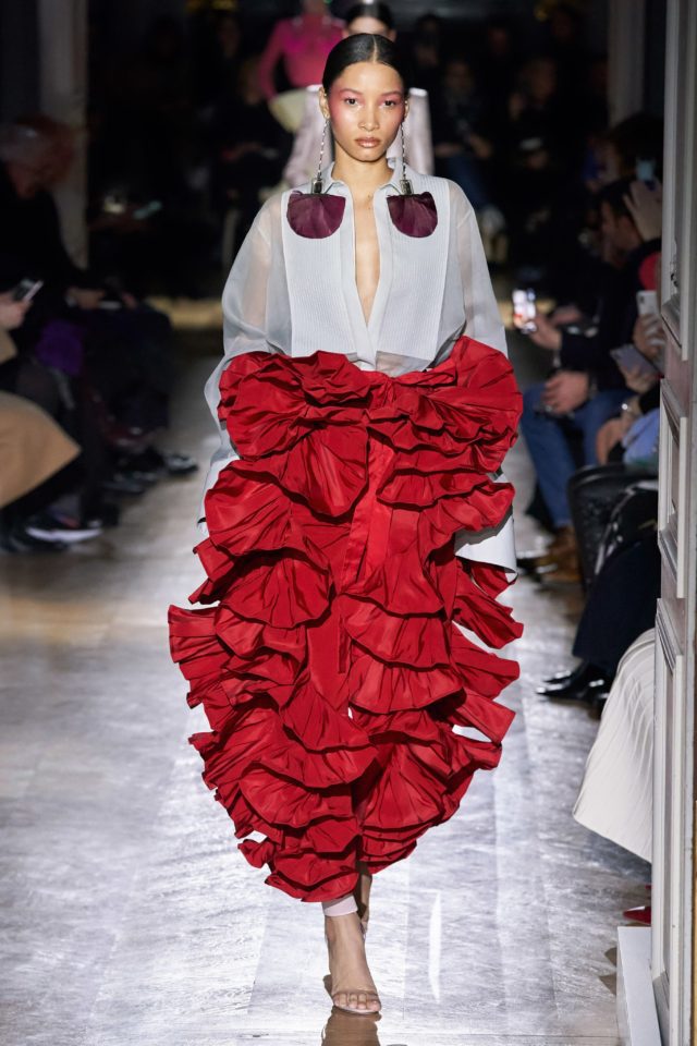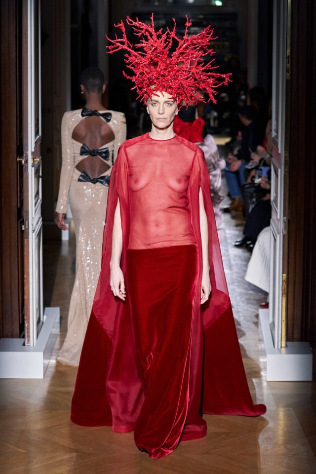 Valentino: «cuando hablas de alta costura, hablas de sueños, pero los sueños son la expresión de algo que es subconsciente. Se trata de la libertad de expresarte»– Las palabras de Pierpaolo Piccioli. Los diseños de inspiración, fueron las cola de pez, sirena, estilos estructurados y lineales. Piccioli busca encontrar una nueva silueta a través de volúmenes, volantes, cuerpos con plisado y lentejuelas.