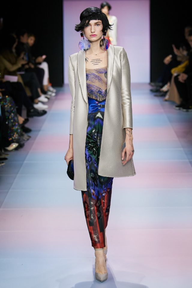 Armani: El estampado IKAT fu el elegido por Giorgio Armani. Un patrón textil que esta entretejido en las historias culturales de los países de todo el mundo y que entró al planeta de la moda por medio de los hippies de la década de 1960. La colección estaba compuesta por capas de transparencias, chaquetas, blazers,cremalleras y muchos colores vívidos.