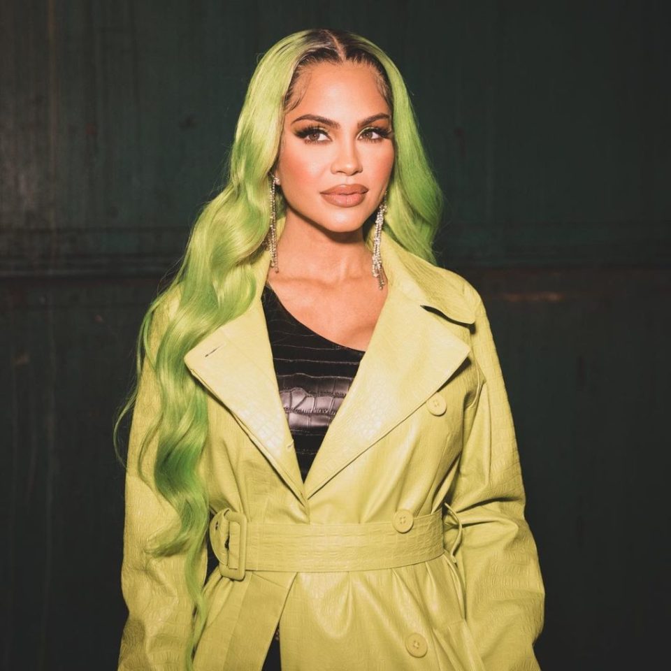Según se pudo observar en la instantánea, Natti Natasha dejó atrás su oscura cabellera para teñirla de color verde fosforescente. Ella acompañó su look con un abrigo del mismo color.