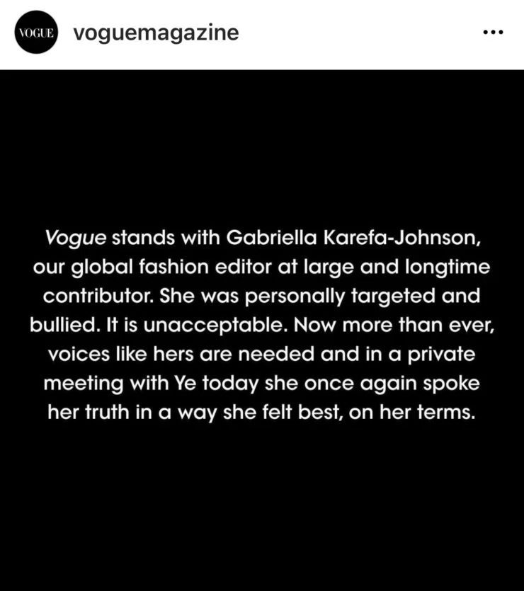 Gigi Hadid fue una de las primeras celebrities en salir a defender a Gabriella Karefa-Johnson. Es que es un gran aporte a la moda, ella fue la primera mujer negra en diseñar una portada de Vogue en 2020 y trabajó con la vicepresidenta Kamala Harris, entre muchas otras. De hecho, hasta Vogue sacó un comunicado defendiéndola. Mientras que los seguidores de Kanye empezaron acusarlo de misógino, gordofóbico y racista.