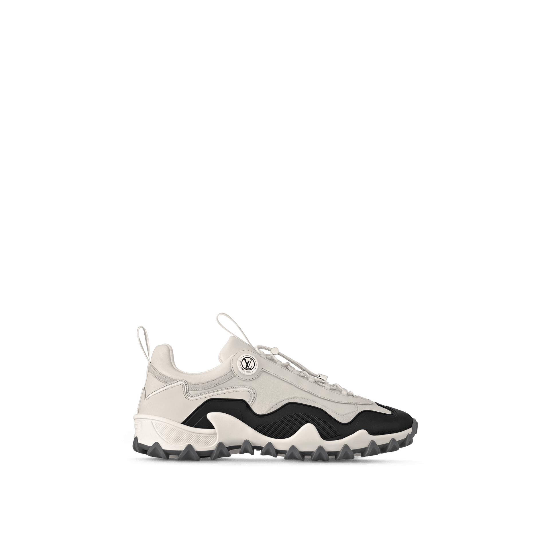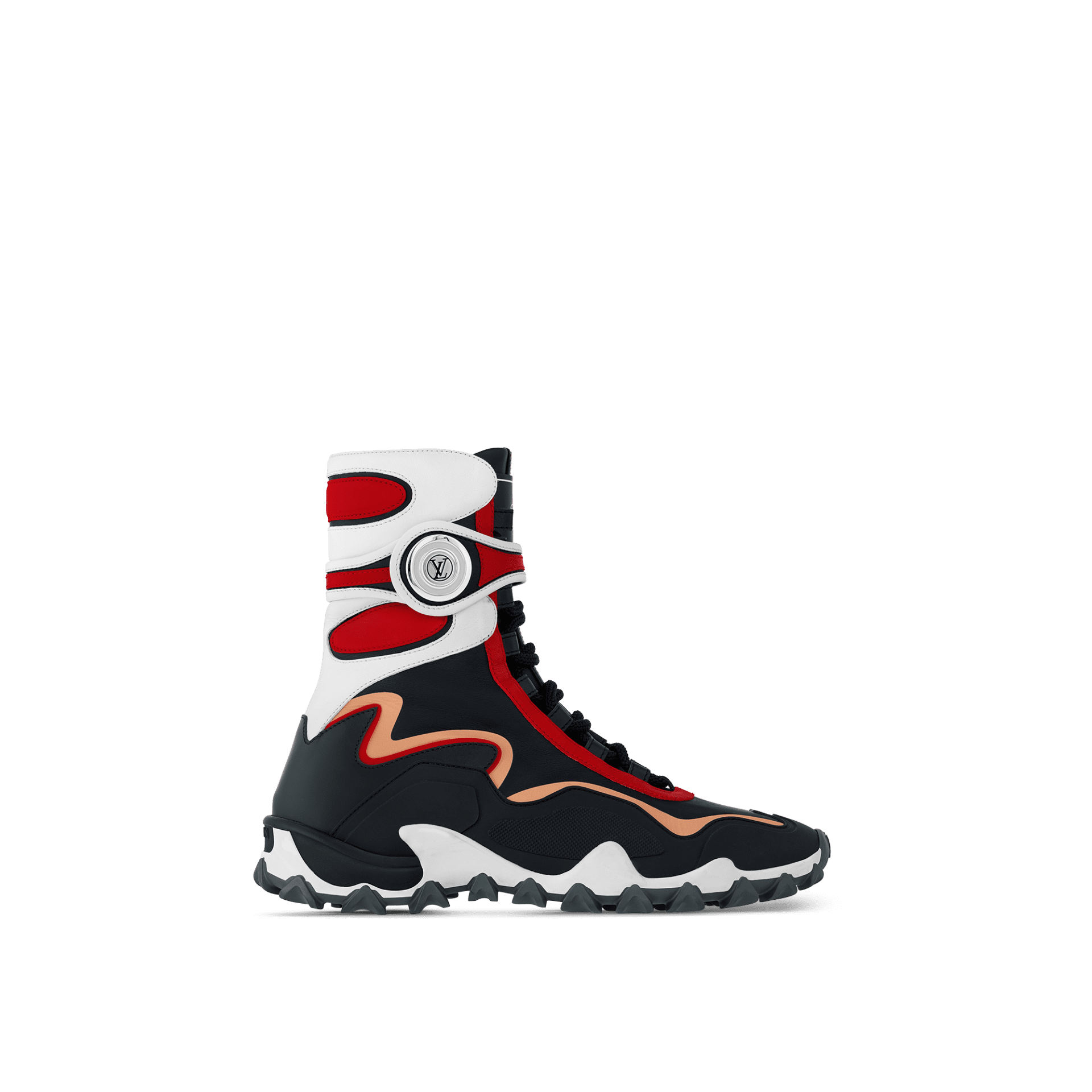 El LV Rush se propone como una bota zapatilla que se extiende por encima del tobillo, así como dos zapatillas adicionales: una versión más alta acentuada con rojo audaz y otra zapatilla más monocromática en blanco o negro. Con una parte superior audaz en ante con cuero de becerro clásico y gomoso, toda la gama está optimizada para el uso diario gracias a su construcción interna ligera y su suela altamente flexible. Un círculo LV metálico señala un toque elevado en línea con Louis Vuitton. La influencia del trail se manifiesta en la zapatilla principal a través de detalles como el tope de los cordones.