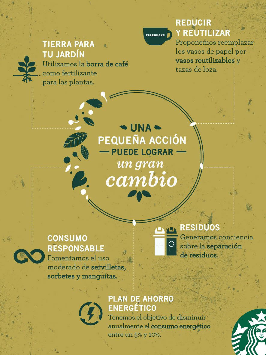 En esta línea, la marca busca generar conciencia en sus consumidores sobre la separación de residuos, el consumo responsable de servilletas, sorbetes y manguitas y participen del programa de compostaje “Tierra para tu jardín” mediante el cual la compañía impulsa a que sus clientes se puedan llevar gratuitamente la borra del café para ser utilizada como abono de tierra y así crear compost en sus casas.