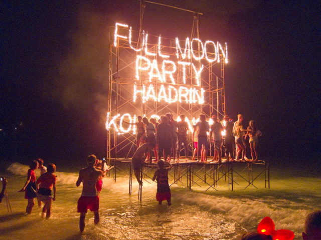 La mejor fiesta a la que fui fue en Tailandia, la “Full Moon”. Es la fiesta playera más famosa del mundo. Se organiza todos los meses en cada luna llena en la playa de Haad Rin en la isla de Koh Pha Ngan. Llega a reunir entre 10.000 y 30.000 personas.