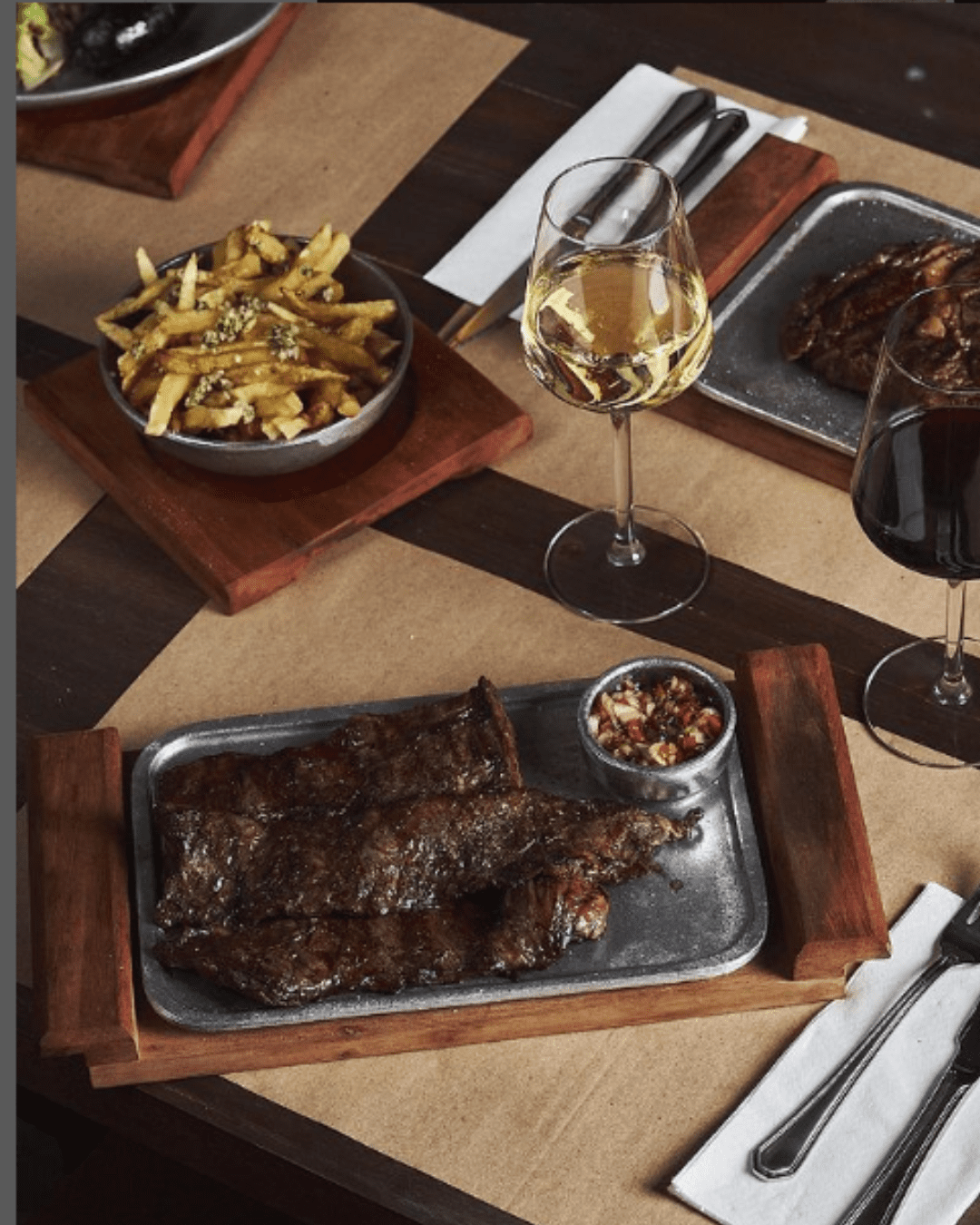 El menú está pensado y diseñado para acompañar los mejores vinos de las bodegas más prestigiosas de Argentina. Cada plato es una combinación perfecta entre las delicias de la parrilla y los sabores de los vinos seleccionados.