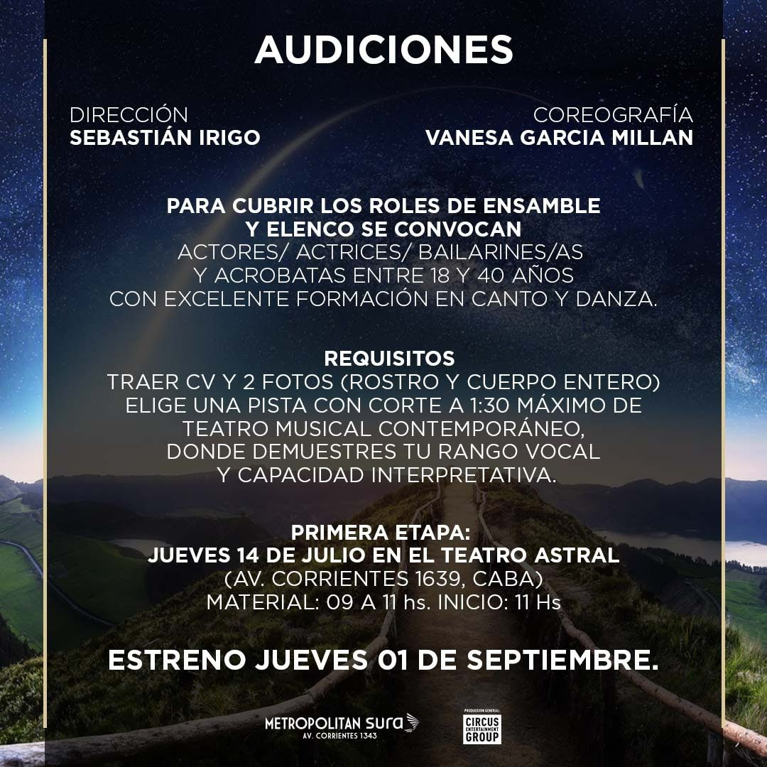 Por lo pronto, el jueves 14 de julio se llevarán a cabo en el teatro Astral, las audiciones para cubrir los roles de ensamble y elenco. El equipo creativo convoca a actores, actrices, bailarines/as y acróbatas entre 18 y 40 años con excelente formación en canto y danza. Los interesados deben presentar CV y dos fotos (rostro y cuerpo entero) y elegir una pista de 1:30 de duración, que sea de teatro musical contemporáneo, para demostrar el rango vocal y su capacidad interpretativa.