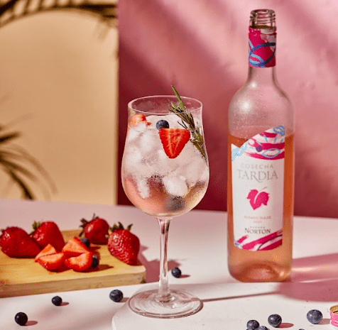 En un vaso con muuuucho hielo, agregar Cosecha Tardía rosado y completar con soda. Sumar unos arándanos y unas frutillas para darle textura y color ¡y a disfrutar!