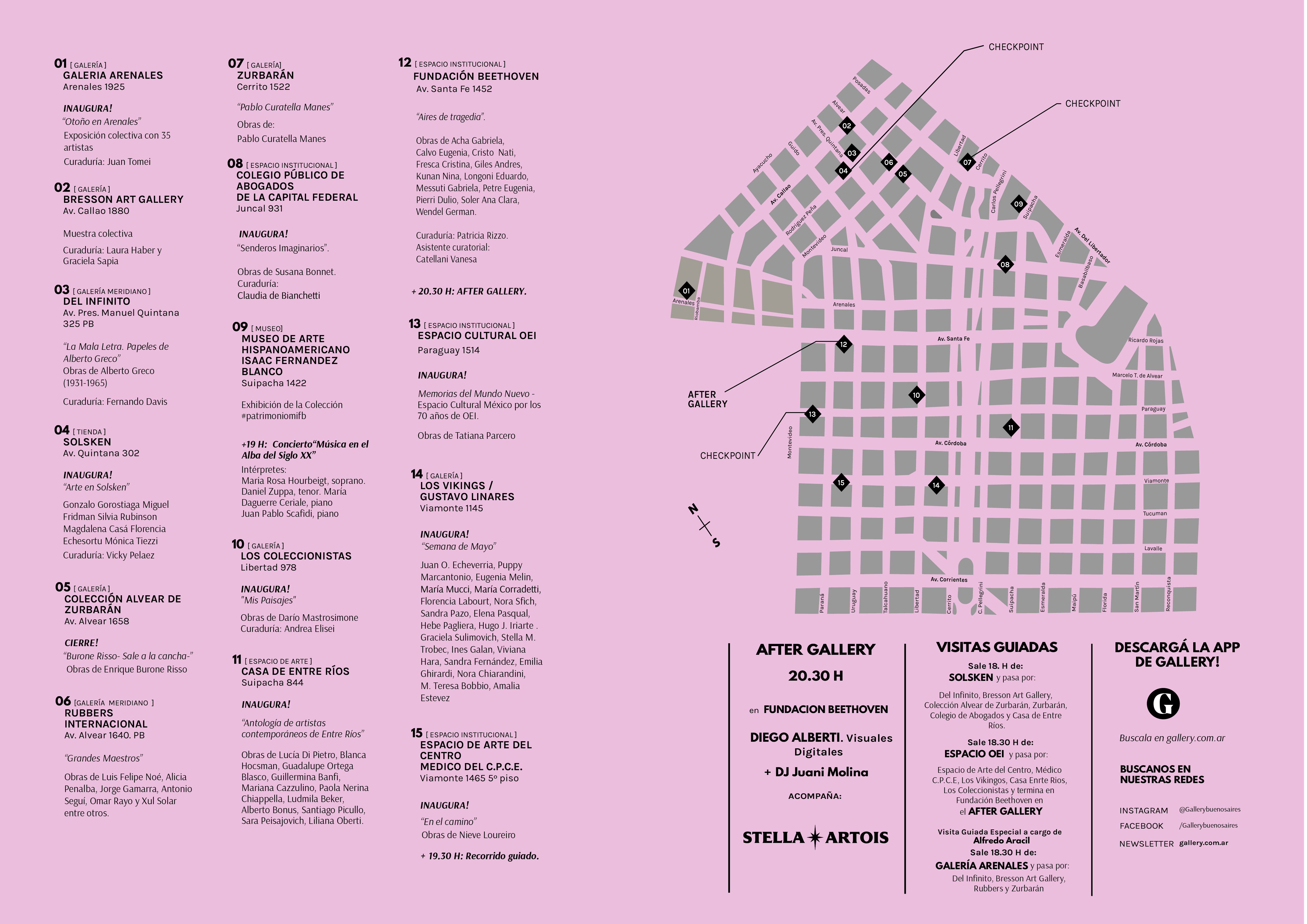 ESPACIO CULTURAL OEI y pasa por: Espacio de Arte del Centro Médico del C.P.C.E., Los Vikings, Casa Entre Ríos, Los Coleccionistas, termina en Fundación Beethoven en el After Gallery.